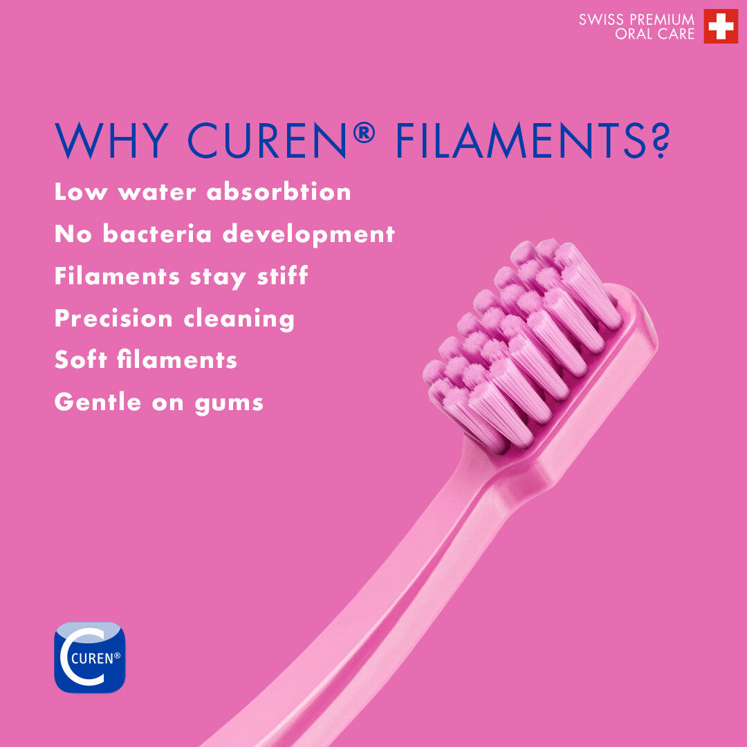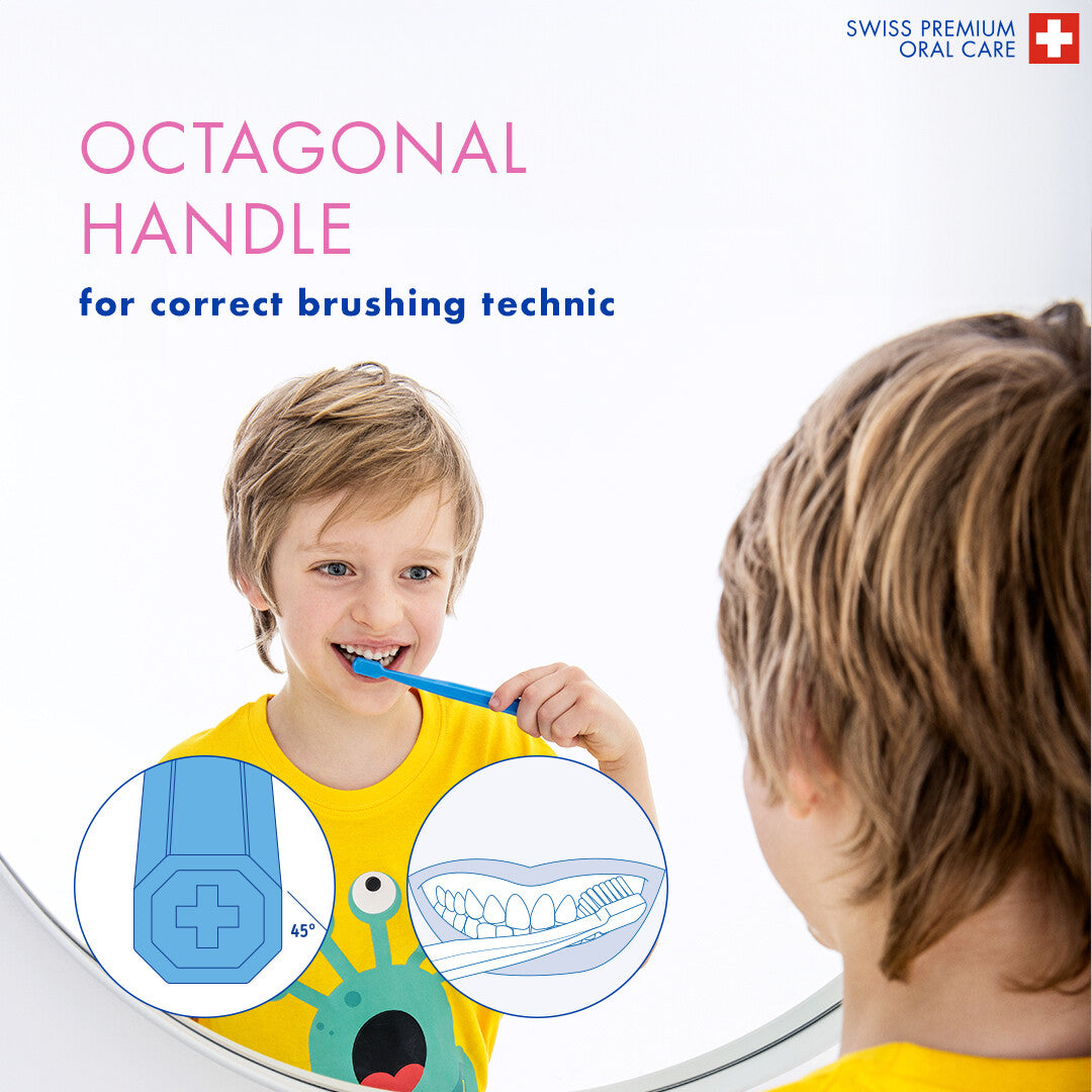 The Curaprox Kids Toothbrush is the ultimate brush for children aged 4 to 12, making dental care fun and effective. With 5,500 ultra-soft Curen filaments with a compact brush head, this toothbrush ensures a gentle yet thorough cleaning that removes plaque while being kind to sensitive gums. Available in six vibrant colors, it’s designed to make brushing an enjoyable experience for kids, encouraging them to take good care of their teeth every day. The ergonomic octagonal handle fits perfectly in little hands, allowing for a comfortable and controlled grip during brushing.