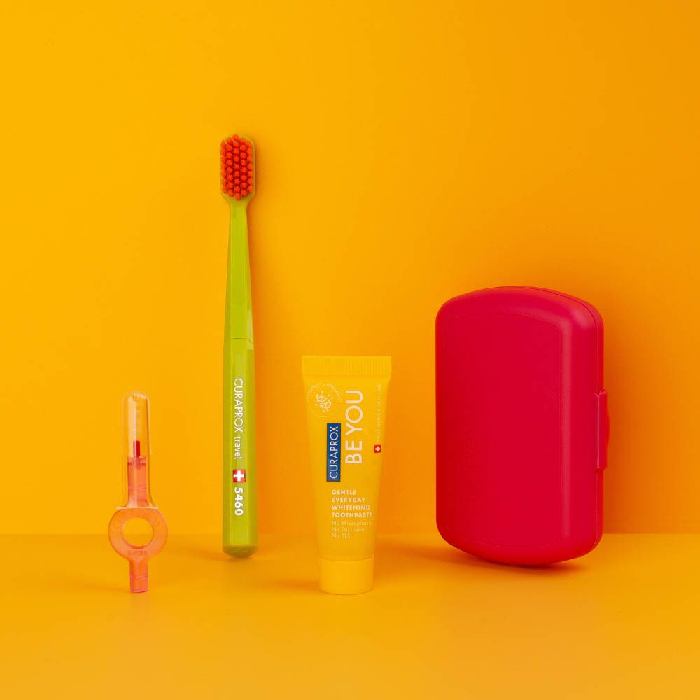 HOW TO USE: Brush twice daily with a pea-sized amount of toothpaste using the ultra-soft Curaprox CS 5460 travel toothbrush, and clean between teeth with the included interdental brushes—for complete, on-the-go oral care, anytime, anywhere.