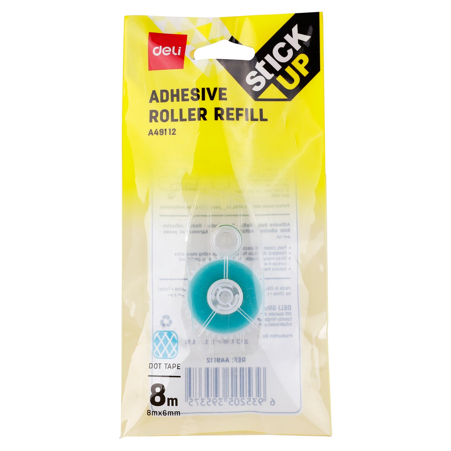 The Deli EA49112 is an adhesive roller refill with transparent, double-sided, dot-type adhesive tape. It provides a fast, clean, and precise way to apply adhesive without any drying time or causing paper to wrinkle. The tape is 6mm wide and 8 meters long. This product is a refill for compatible Deli adhesive roller dispensers, such as the EA49011.