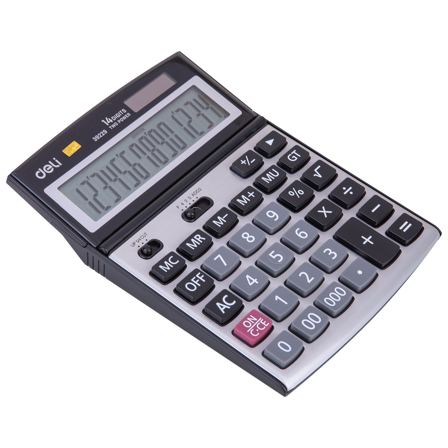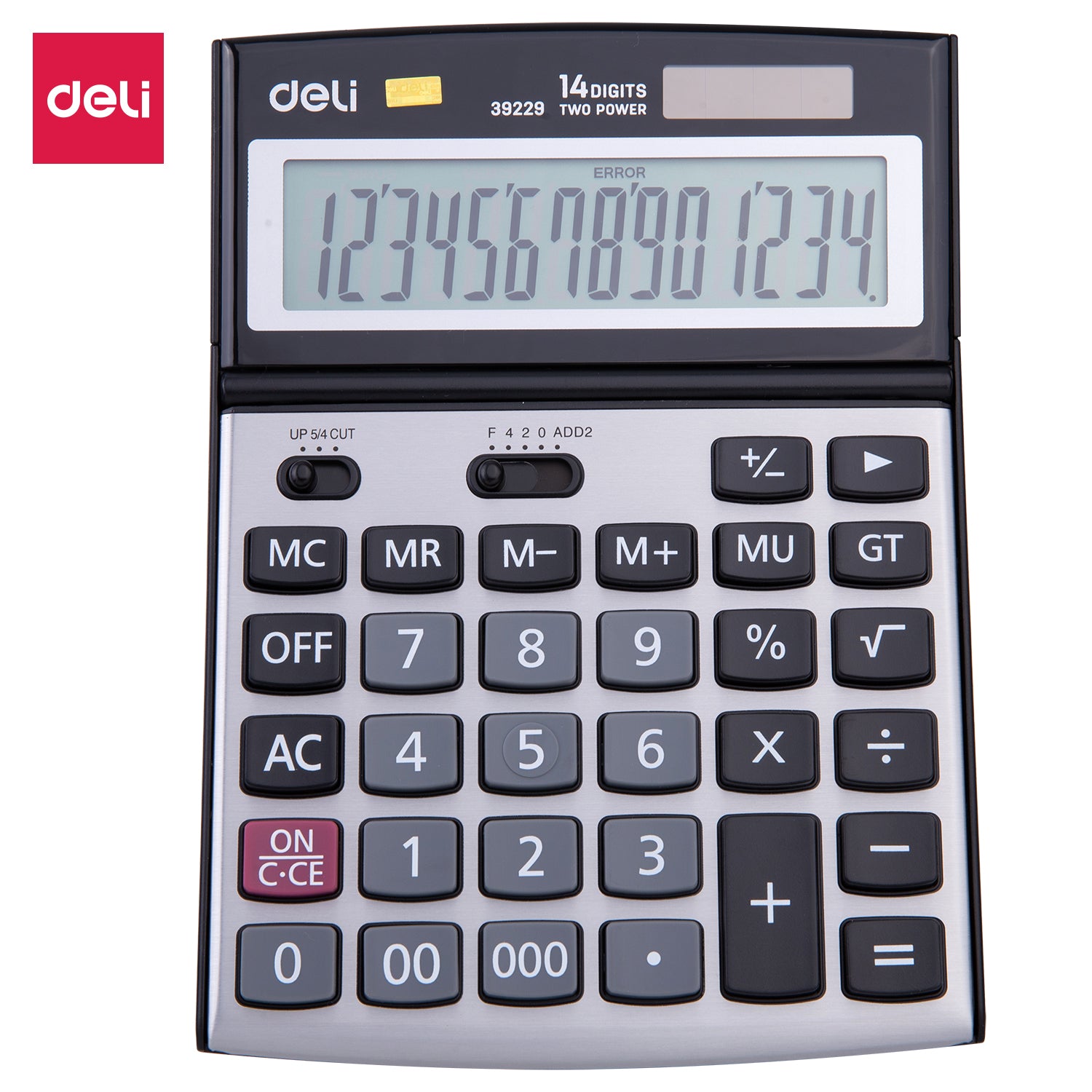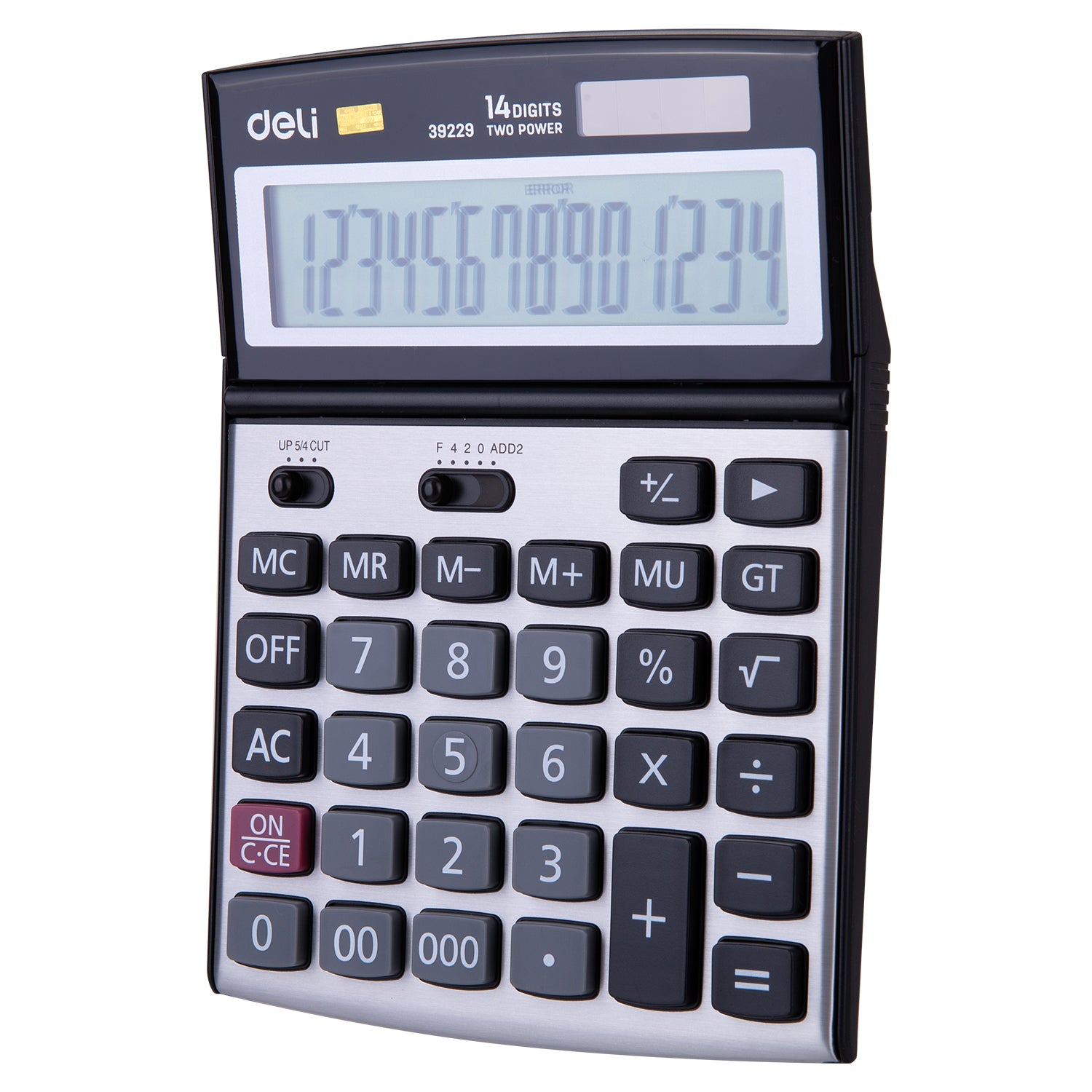 The Deli E39229 Desktop Calculator is a sleek and professional tool with a durable silver metal panel. It features a large, clear 14-digit LCD display, making it suitable for complex calculations in finance, business, and other professional fields. The calculator has a dual power source (solar and battery) for uninterrupted use. It also includes an auto-power-off function to conserve energy and is designed with anti-slip pads on the bottom for stability on your desk.