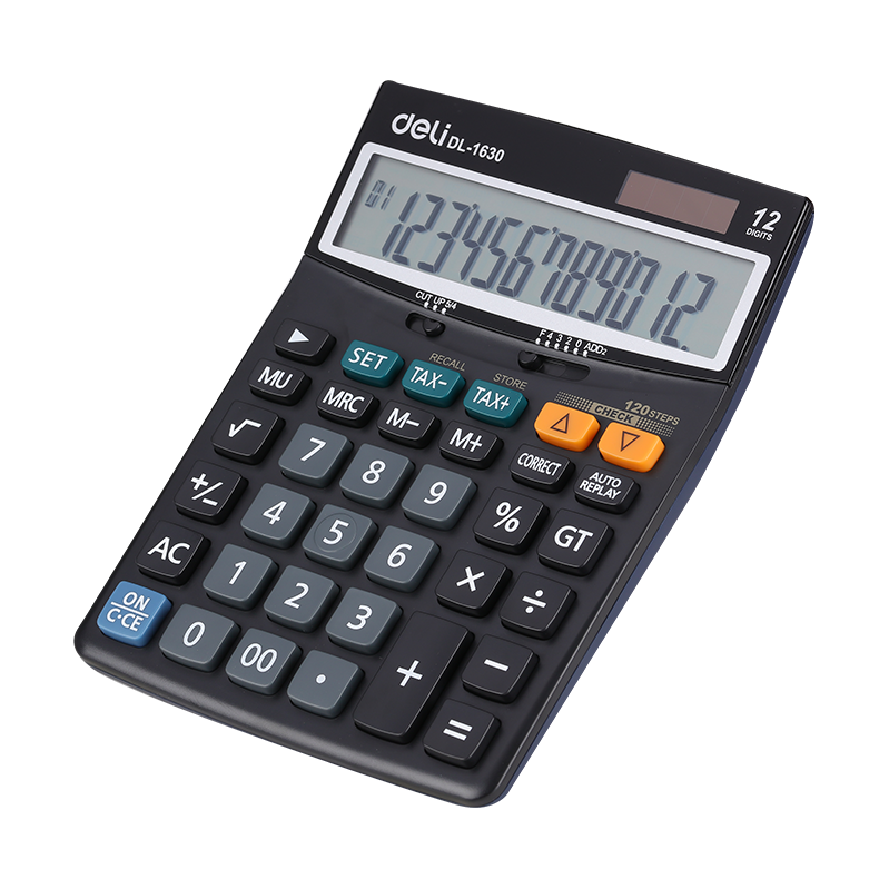 The Deli E1630 Calculator is a durable and highly functional desktop calculator. Made with a plastic body and keys, it is designed for comfortable use. The calculator features a large, tilted 12-digit LCD screen with an acrylic cover for clear, easy viewing. It has a dual power source (solar and battery), ensuring it is always ready to use. This model also includes a tax function and a 120-step check and correction function for enhanced accuracy.