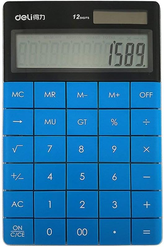The Deli E1589 Calculator is a durable and stylish desktop calculator with a plastic body and a vibrant blue color. It features a large, 12-digit display with an acrylic coating that protects the screen and provides a clear view. The calculator operates on a dual-power system (solar and battery), ensuring it's always ready for use. Its anti-slip pads on the bottom corners provide stability, and the flat button design is comfortable for a wide range of tasks. This calculator is a reliable tool for students, home users, and professionals.