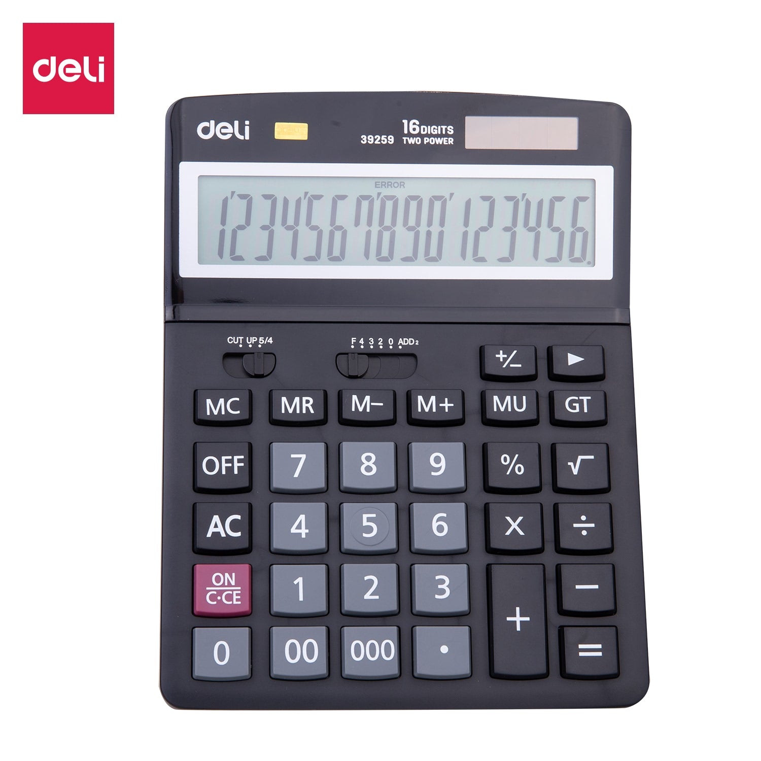 The Deli E39259 Desktop Calculator is a robust calculator designed for extensive calculations, featuring a large 16-digit display. It has a durable plastic body and an easy-to-view tilted acrylic screen cover. The calculator is powered by both solar and battery power, providing reliable and uninterrupted use for all your professional and business needs.