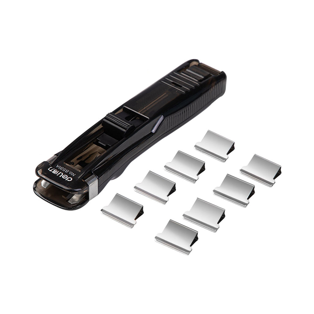 The Deli 8591A Clip Fastener is an efficient document binding solution that works as an alternative to staples and paper clips. It is a push-style clip dispenser that comes with 8 supplementary 16mm steel clips. The fastener securely holds papers together without punching holes and the clips can be detached and reused. It's a convenient and durable option for organizing documents in the office, school, or home.