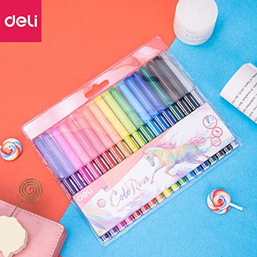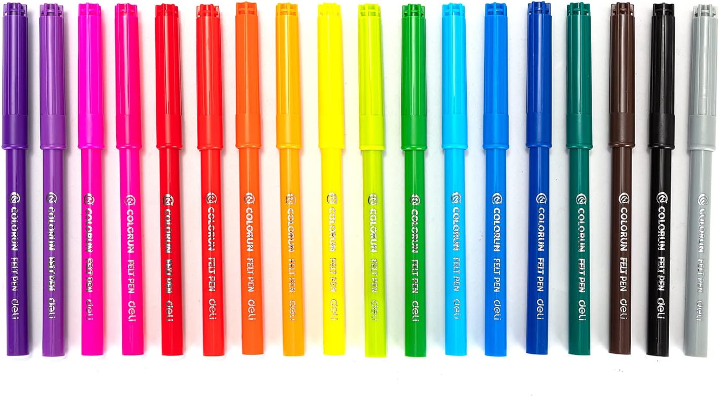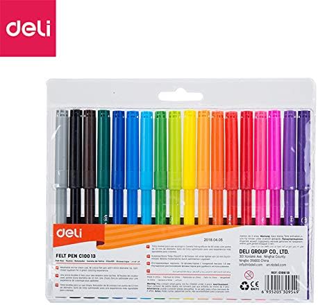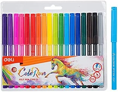 The Deli EC10013 is a set of 18 washable felt pens with a 1.0mm fiber bullet tip. The pens have a round barrel and come in a variety of bright, vibrant colors. The ink is non-toxic and has a low odor, making them suitable for both children and adults. They are ideal for various creative projects such as coloring, drawing, and sketching.