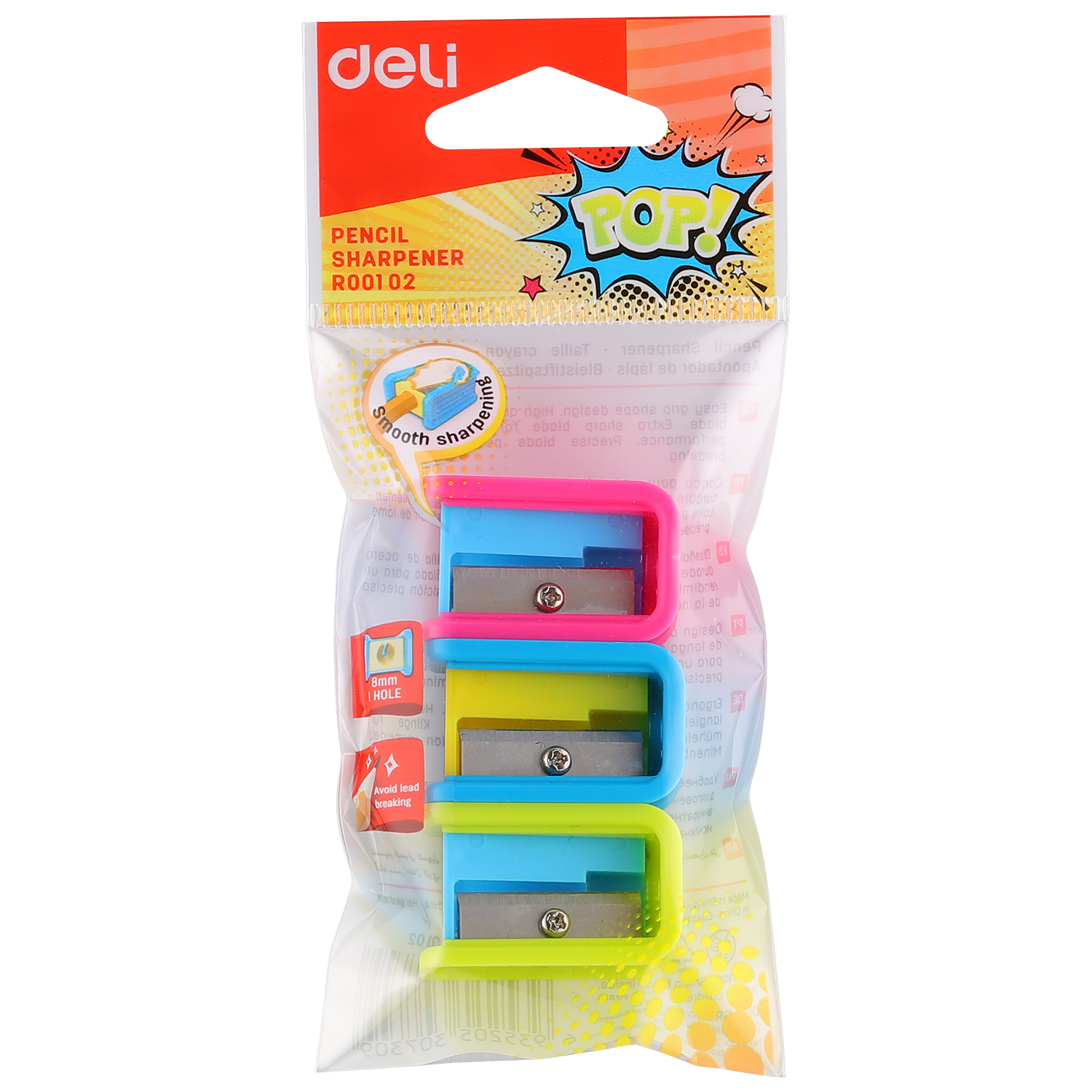 The Deli 1-Hole Sharpener ER00102 is a simple and reliable tool for sharpening standard-sized pencils. This convenient box contains three single-hole sharpeners in an assortment of vibrant colors, making it an excellent and economical choice for students, classrooms, or home use. Each sharpener is fitted with a durable metal blade that is designed to provide a clean and sharp point every time, minimizing lead breakage and pencil waste. The compact size and enclosed body with a waste container ensure a mess-free and efficient sharpening experience.