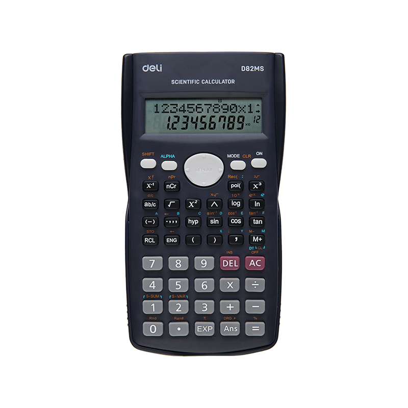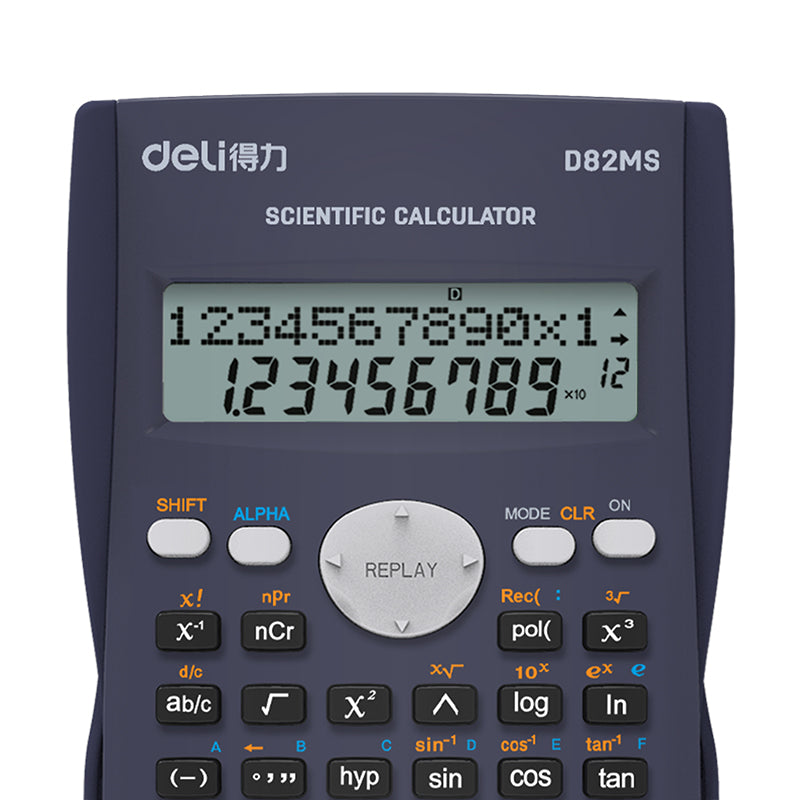 The Deli ED82MS Scientific Calculator is a multifunctional tool for students and professionals. It features a plastic body in a dark blue color and comes with a sliding protective cover. The calculator has a two-line display with 10+2 digits, designed to show expressions and results simultaneously, similar to a textbook. It is equipped with 240 functions, including statistical, fractional, and trigonometric calculations. The calculator operates on a dual-power system (solar and battery), ensuring it is always ready for use.