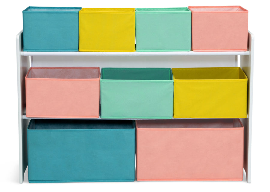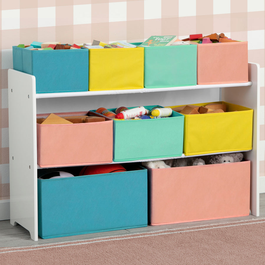 Add a splash of color to your kids room with the Delta Children Deluxe Toy Organizer with Bins. This sturdy and well-made 9-Bin toy organizer helps keep all the toys, books and other belongings neatly arranged in one place. There are nine different sized high quality fabric bins that provide ample storage space. Books, craft supplies and other small items can be conveniently organized in the top two tiers and larger items like dress up clothes, shoes and stuffed animals can be stored in the larger bottom bins. This toy organizer with bins comes in gender neutral colors making it perfect for girls and boys.