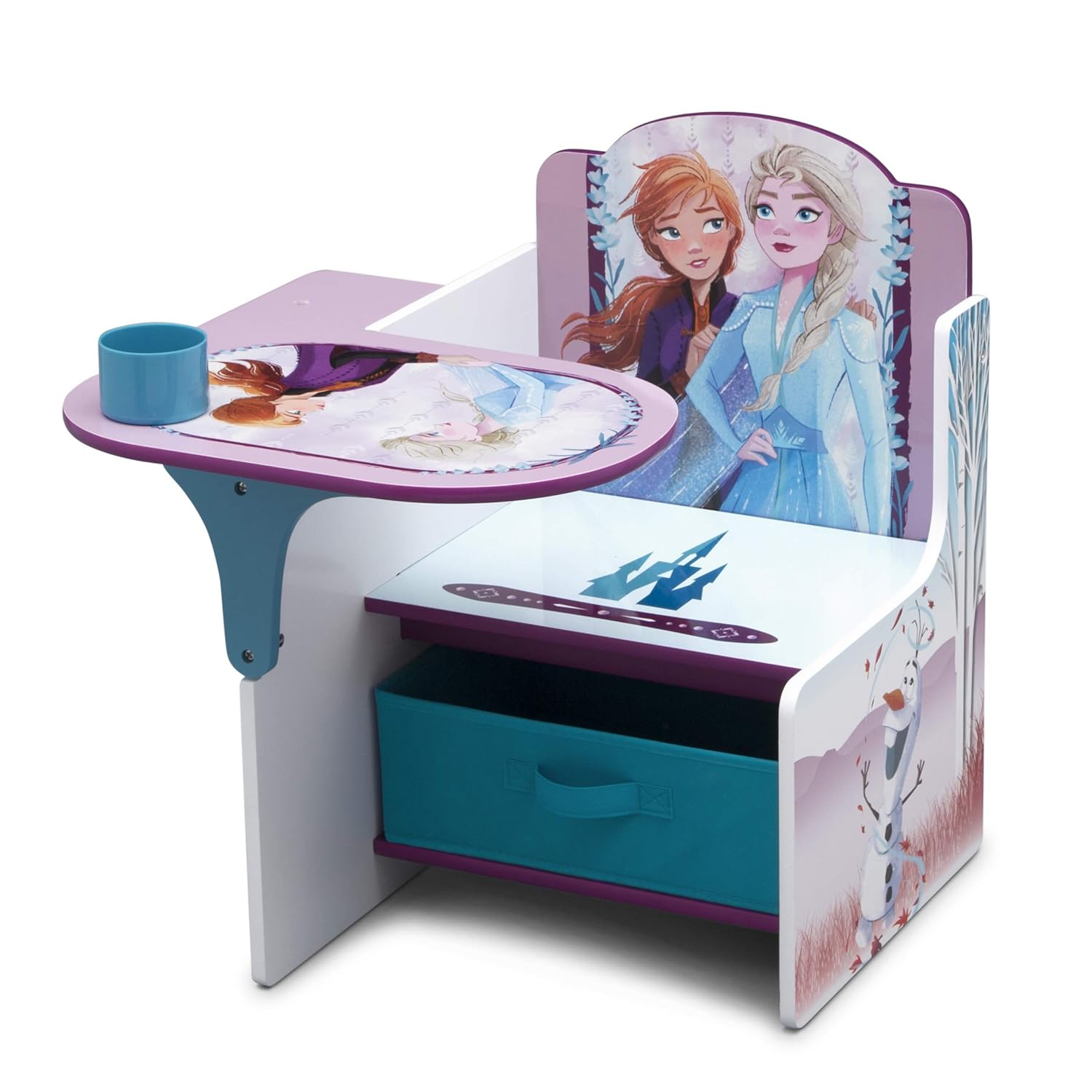 Donƒ??t get left out in the cold, get this Disney Frozen II Chair Desk with Storage Bin by Delta Children that will instantly warm hearts! Offering kids the perfect spot for snack time, crafts, playtime or homework, this smart and sturdy chair with colorful graphics of Anna, Elsa, Olaf, Kristoff and Sven also features a built-in cup holder to hold markers and a fabric storage bin underneath for additional art supplies or toys.