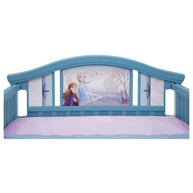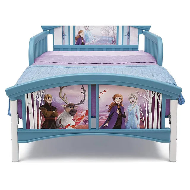 - For the Frozen II Fan: Accented with colorful decals of Anna, Elsa, Kristoff, Sven and other Frozen-inspired graphics, this icy blue kids' toddler bed brings a flurry of enchantment to any bedroom.