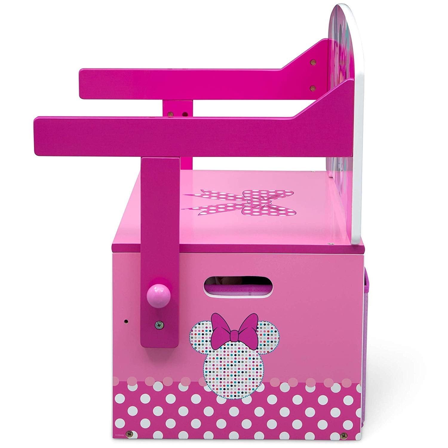 Bring home the fun-loving charm of the Minnie Mouse Activity Bench. It's 2-in-1-design converts from a storage bench to a desk in seconds. An adorable addition to your child's Clubhouse, this clever activity bench will have your child smiling from ear-to-ear when they see the colorful graphics of Mickey, Minnie, Donald Duck and the rest of the lively bunch. A fun and exciting item.