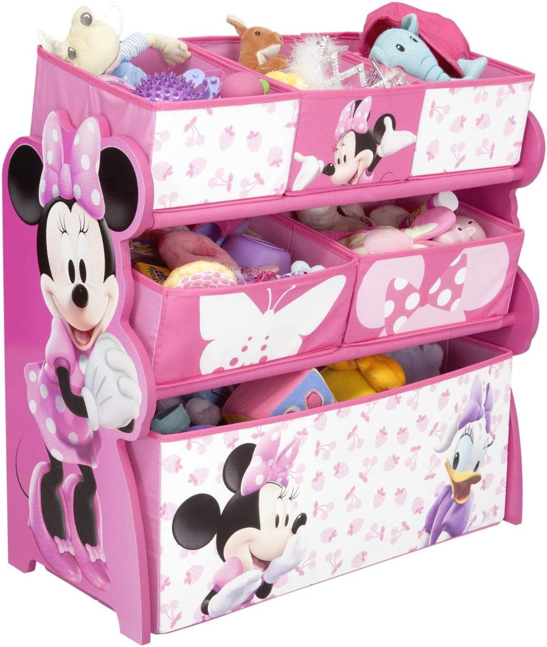 This "Delta Children Minnie Mouse Multi Bin Toy Organizer " is a multi purpose toy organizer.Designed for most storage needs, it can help save space at home and keep items in a more organized manner,featuring six uniquely sized fabric bins and a sturdy wood frame, it's decorated with colorful graphics of Minnie Mouse leading.It is a perfect way to store things and helps to keep your house clean and beautiful.