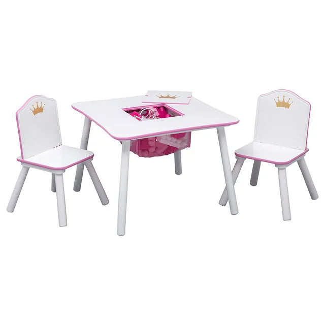 The Princess Crown Kids Chair Set and Table is fit for a fairy-tale. The set includes two chairs and a coordinating table with a storage cubby in the middle to keep art supplies or toys. The perfect place to hold court, tea parties, tackle art projects or eat, this durable wood chair set and table will encourage a fun environment for your little one to learn and play.