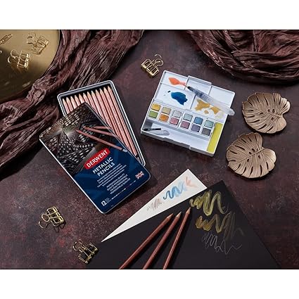 Derwent Metallic pencils are shimmering, highly metallic pencils that blend beautifully together to create vivid and striking metallic effects, particularly on dark paper. The metallic formulation heightens the appearance of the colour; the shimmering pigments and strong core produce brilliant definition and rich colour application.