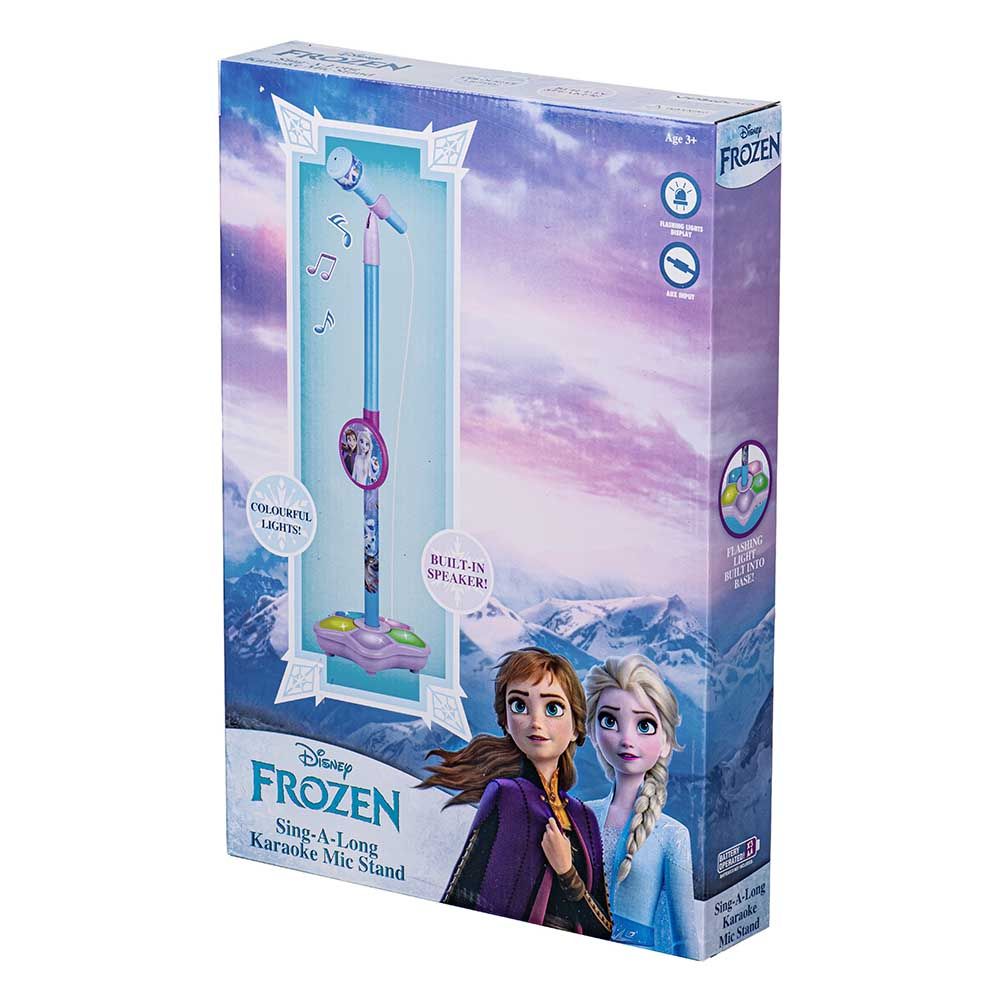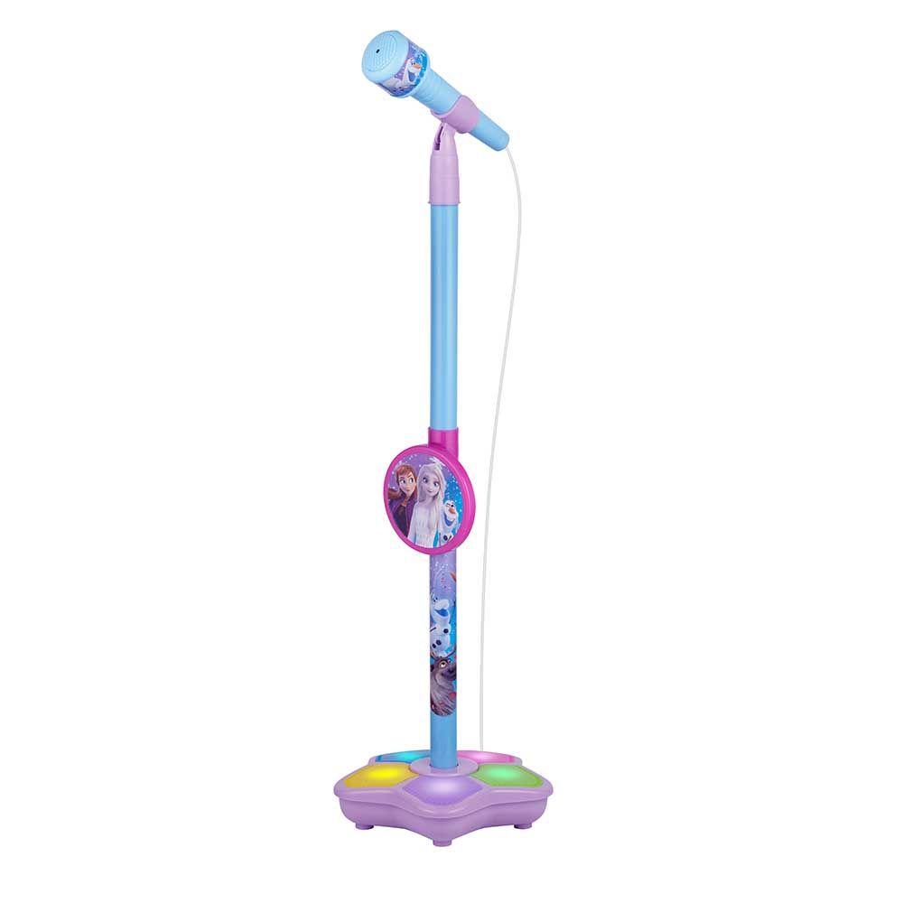 The Disney's Frozen RGB Single Microphone Karaoke Stand by Volkano easily connects to your device via AUX. Sing along loud to the tune with the built-in speaker. An adjustable stand means just the right height for different sized kids and flashing light built into base.