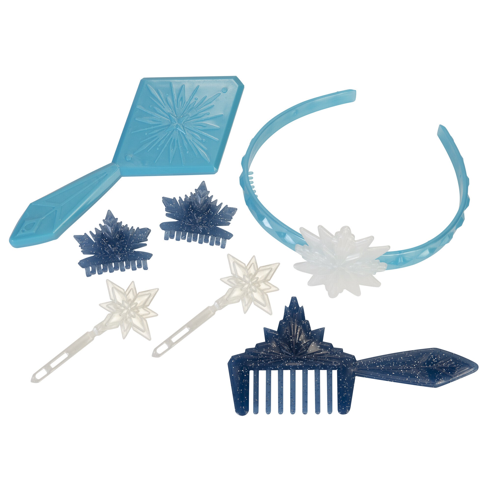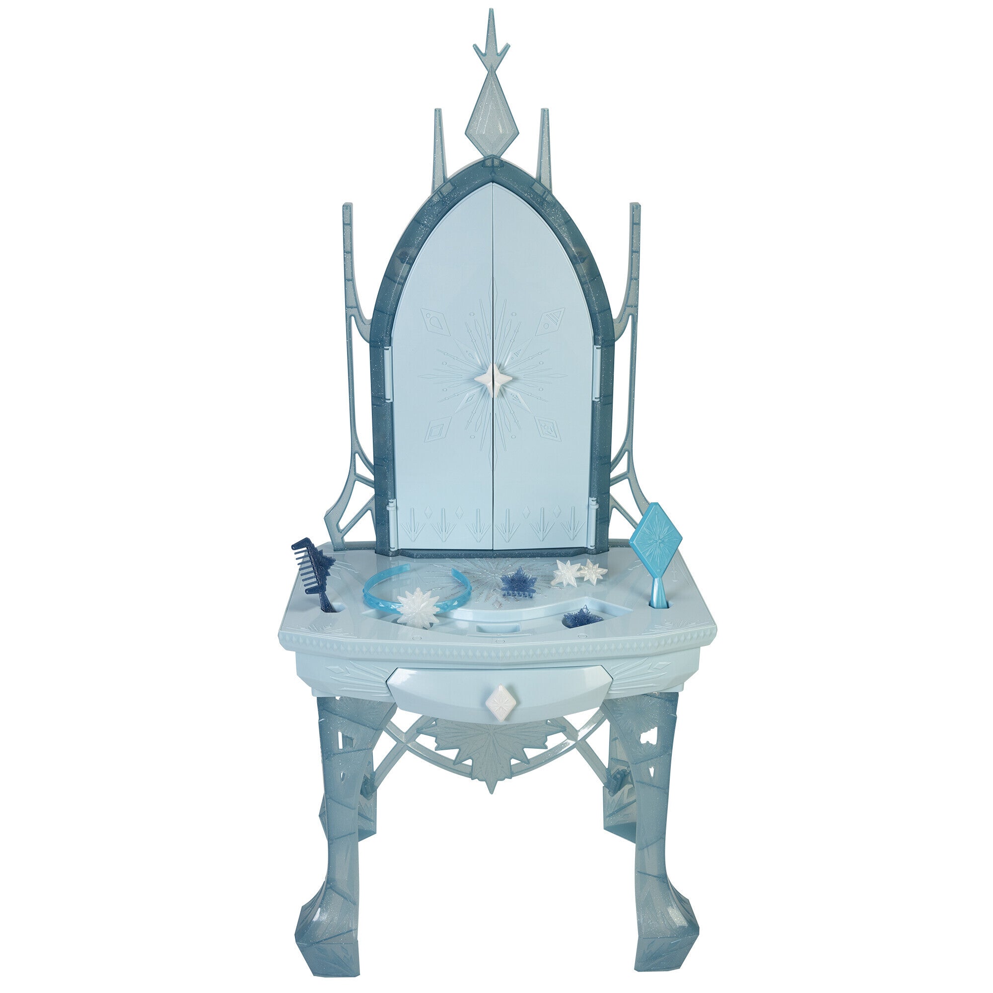 Celebrate the story of Elsa with Disney’s Frozen 2 Elsa's Enchanted Ice Vanity! Get ready to explore Elsa's world with this enchanting vanity inspired by Elsa's ice powers in the film. Open the vanity doors and see the Enchanted Forest appear in stunning lights! Follow the story of Elsa's amazing journey in Disney’s Frozen 2 and hear ""Vuelie"", “All is Found”, ""Into the Unknown"" and “Show Yourself” play as story moments inspired by the film appear through the vanity’s mirror. Stunning vanity includes hair play pieces and drawer for storage for countless ways to style your hair and keep all your accessories together.