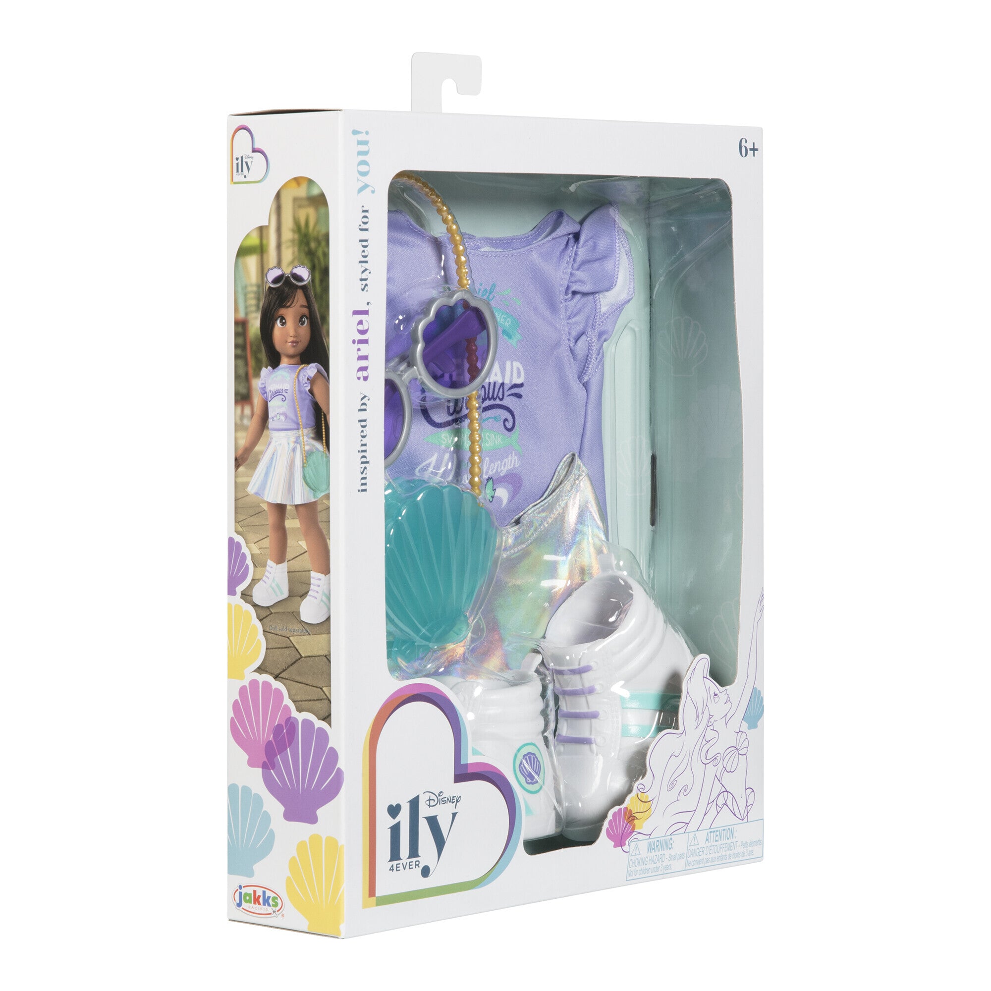 Inspired by Ariel 18-inch doll outfit from Disney ily 4EVER,Perfect look for discovering new places and things!,6-piece outfit features a shimmery skirt, sea-shell purse and more!,Fashion compatible with most 18-inch dolls