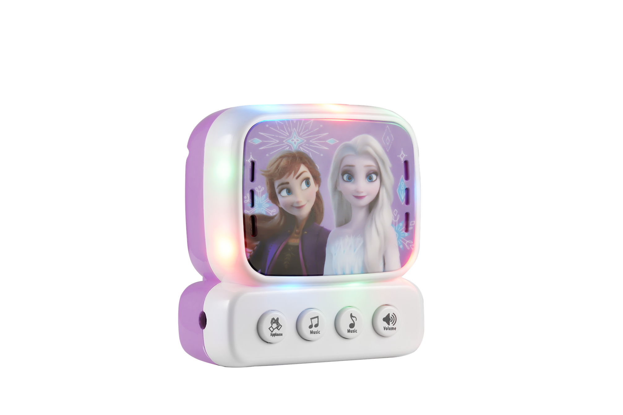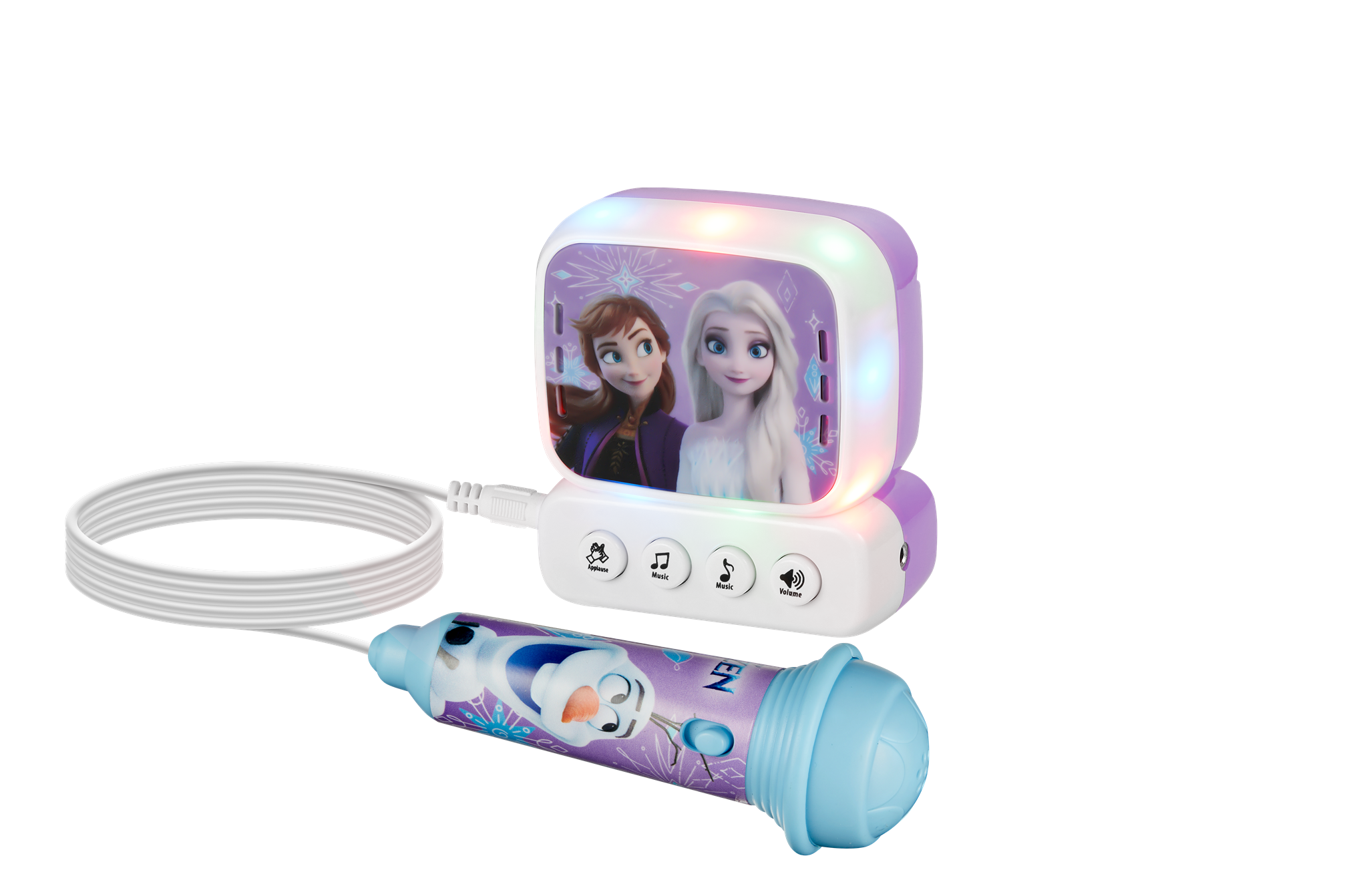 Disney's Frozen battery operated kids mini-karaoke has plenty of built-in songs and RGB lights for sing-along fun. With the convenient belt hook and single microphone can be carried anywhere!