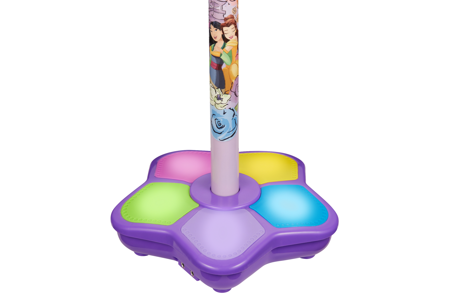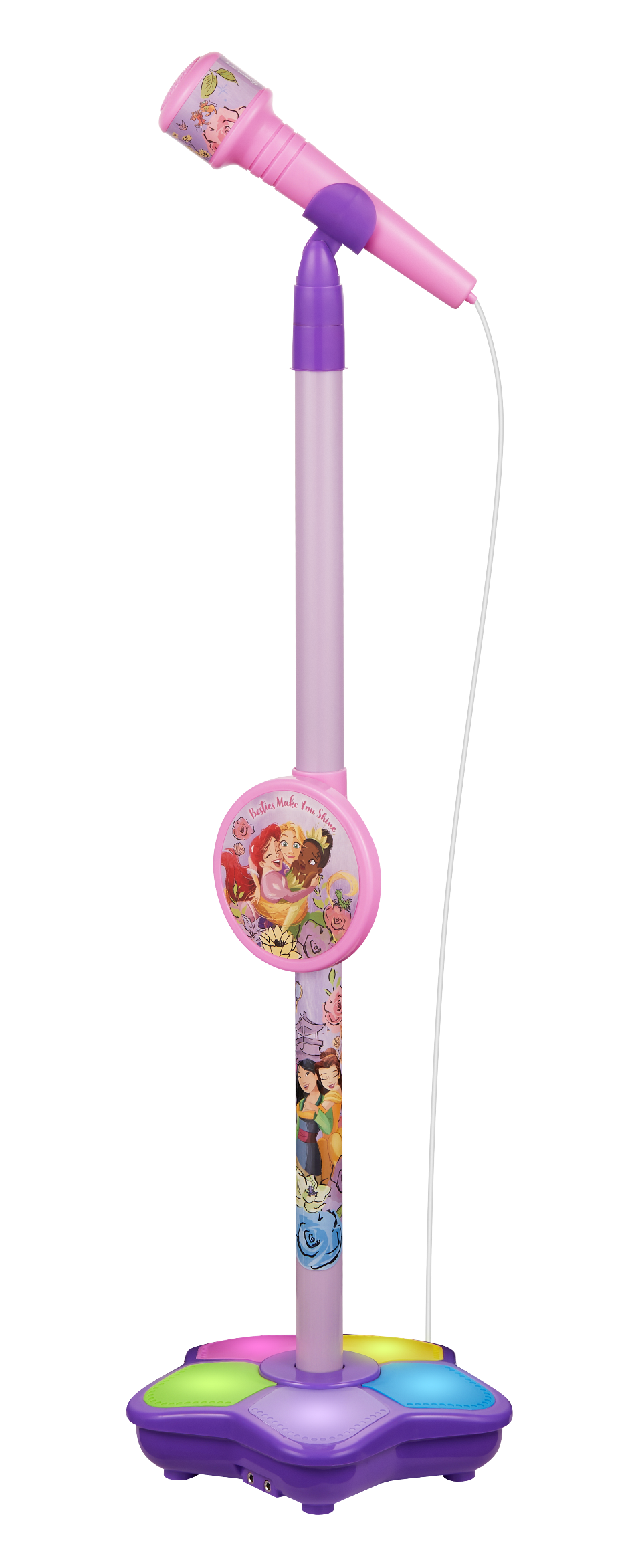 The Disney's Frozen RGB Single Microphone Karaoke Stand by Volkano easily connects to your device via AUX. Sing along loud to the tune with the built-in speaker. An adjustable stand means just the right height for different sized kids and flashing light built into base.