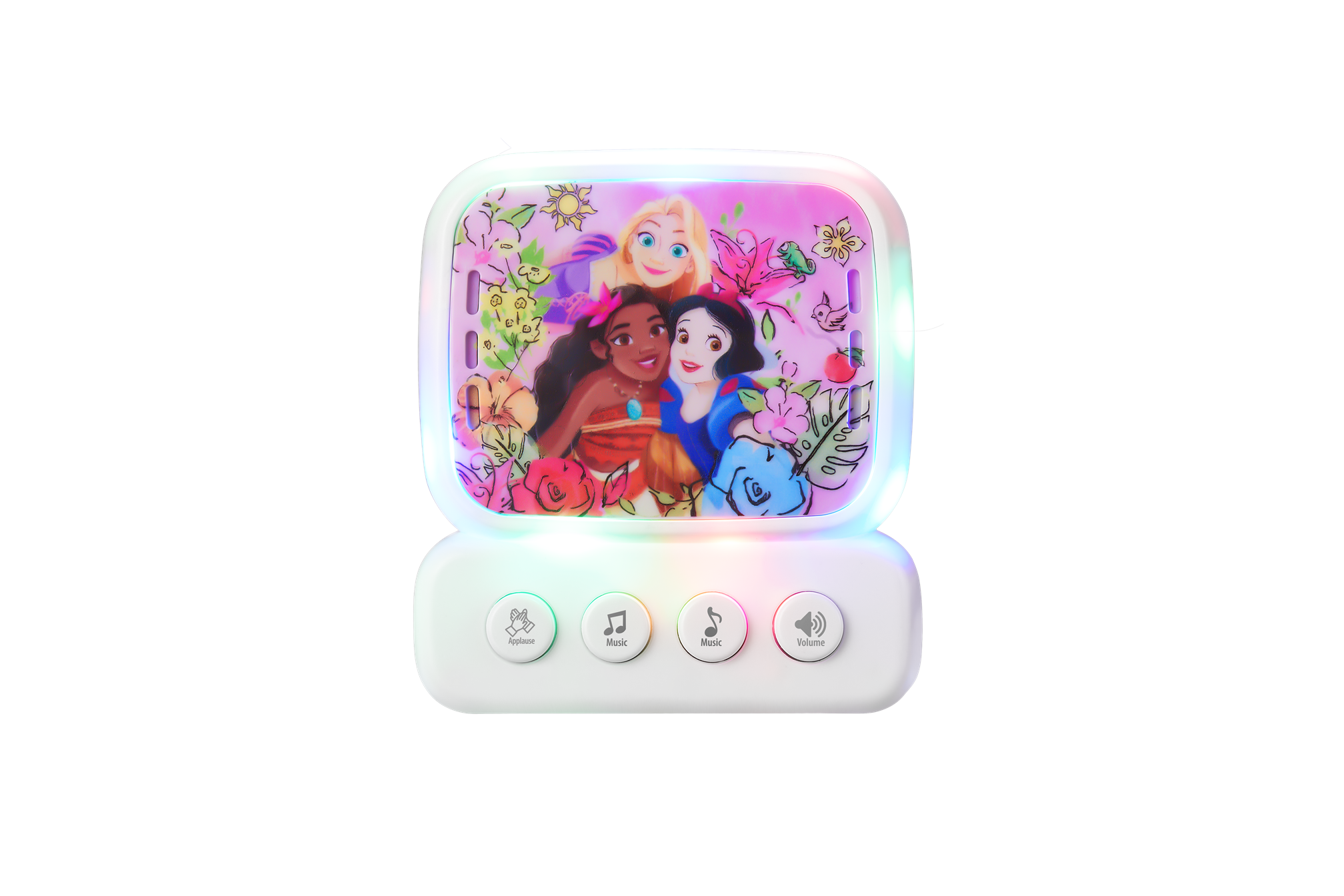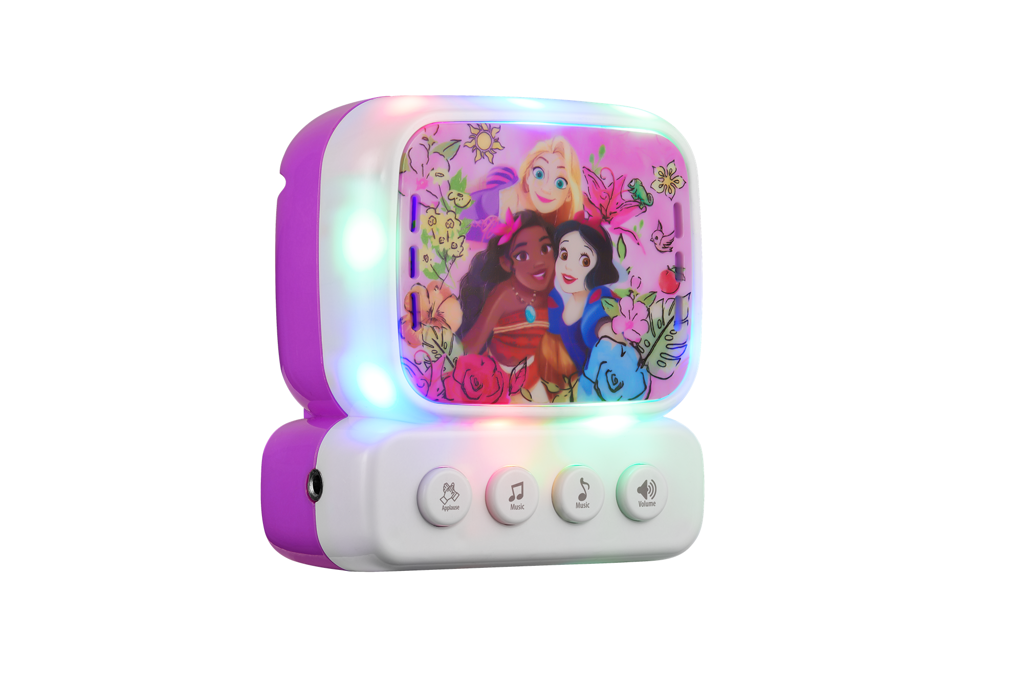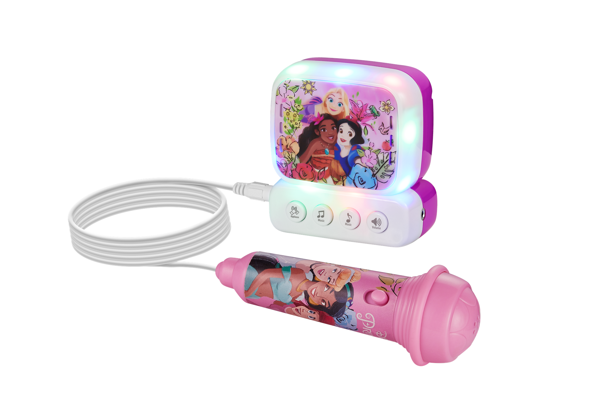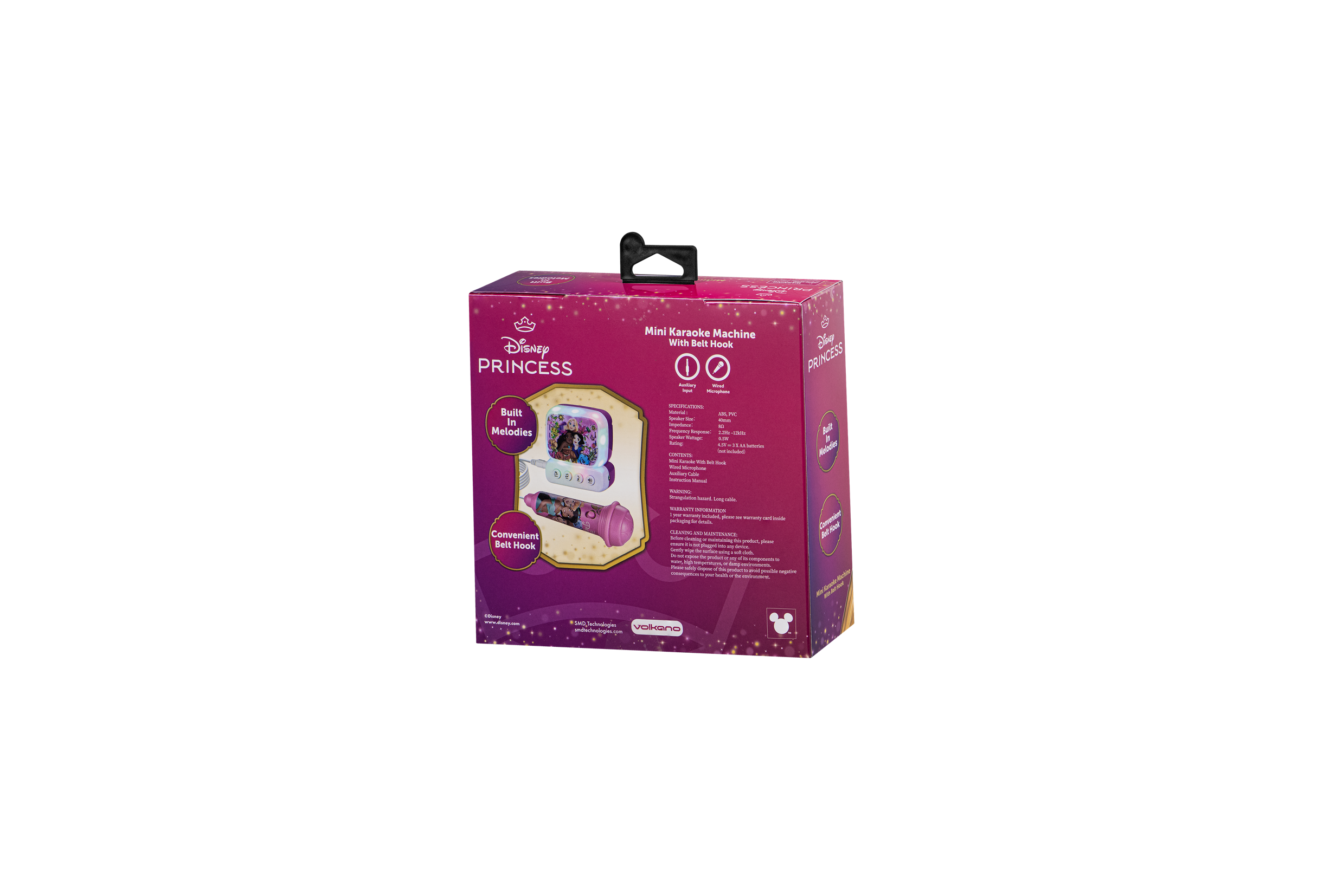 The Disney Princess themed mini karaoke machine for kids features a microphone, speaker, belt hook for portability, and connects via AUX to play music, allowing children to sing along to their favorite Disney tunes, part of a series that also includes Marvel (MV-3650-SM) and Frozen (DY-3650-FR/FZ) versions.
