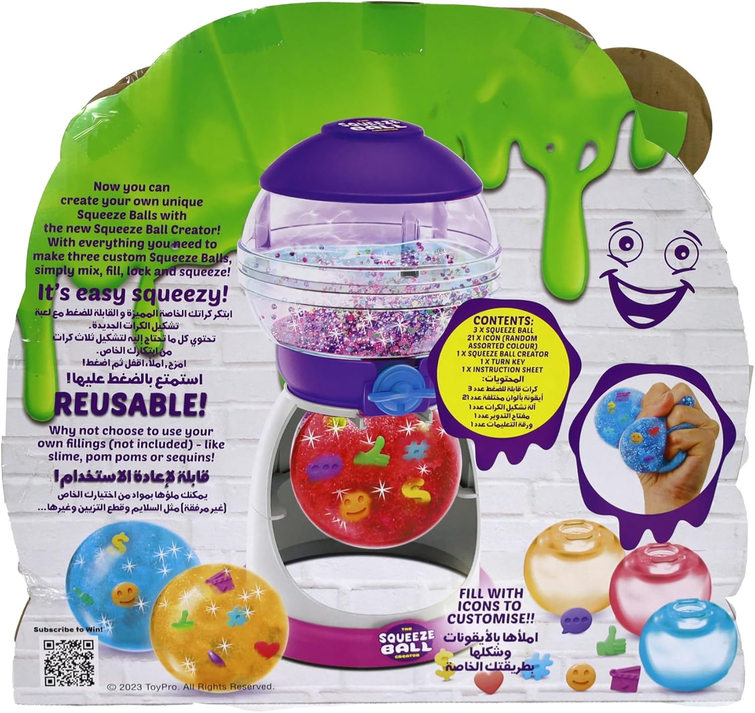 Includes everything you need to make three reusable squeeze balls - simply mix, fill, lock and squeeze! Its easy squeezy! The Squeeze Ball Creator comes with 21 super cool reusable emoji icons that you can add into your squeeze ball to create amazing designs! Fill with icons to customize your squeeze balls and create unique designs. Or why not use your own fillings like slime, pom poms or sequins.