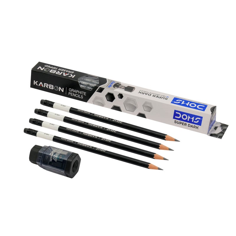 The Doms Karbon RT Pencils are a pack of 12 pencils designed to provide a "Super Dark" and smooth writing experience. The "RT" stands for "rubber-tipped," which means each pencil has an eraser at the end. These pencils are made with high-quality graphite and well-treated wood for easy and smooth sharpening. They are ideal for both writing and drawing, providing dark and neat lines.