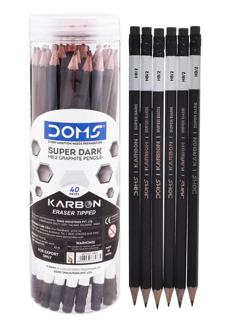 The Doms Karbon RT Pencils come in a convenient plastic jar containing 40 pieces. These are typically "super dark" graphite pencils, often with an HB/2 grade, designed for smooth and consistent performance. They are suitable for a variety of uses, including writing, drawing, sketching, and shading. The plastic jar serves as a useful storage container, keeping the pencils organized and protected.