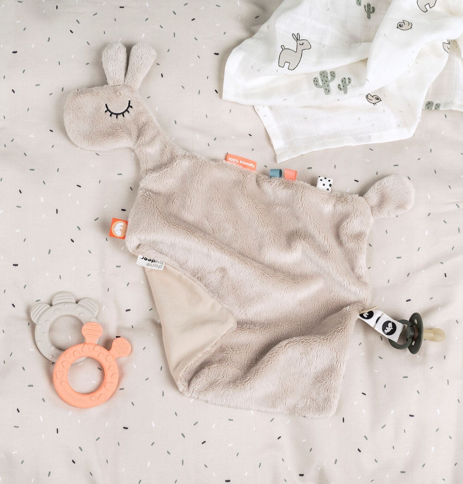 A set of three burp cloths with Lalee print and soft colours. The organic GOTS certified burps are comfortable, breathable and practical. The multi-purpose cloths are a baby must-have for every parent. The cute muslin burps will soften even more and get a thick waffled look when washed. Perfect when it is time for a burp after feeding, when the little ones start eating on their own or as an underlay when changing nappies.
