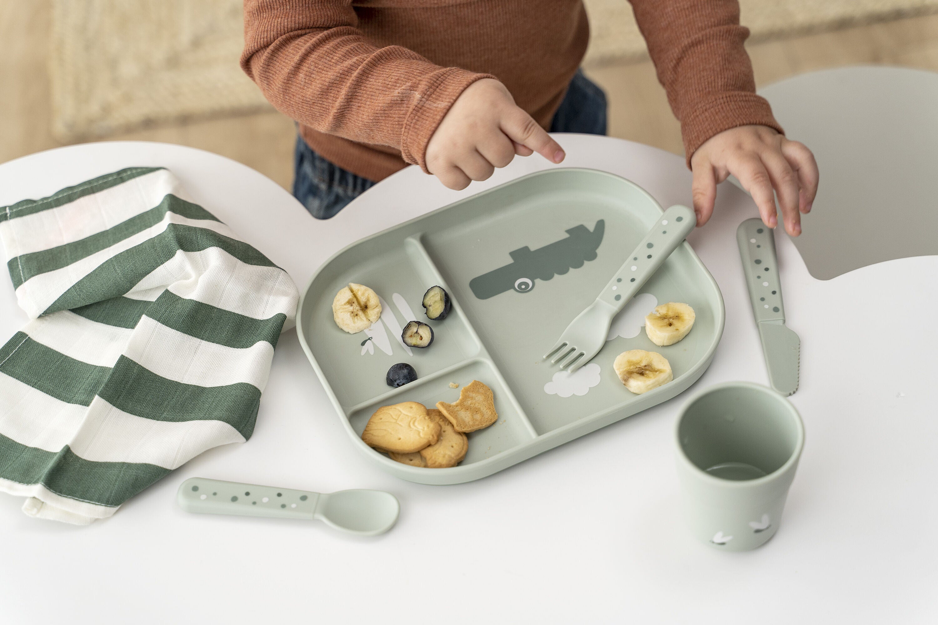 The compartment plate in green is printed with a cool motif of Croco the crocodile gazing at a couple of fireflies. Croco's curiosity will inspire your child to explore the food on the plate. The base's darker green adds a nice two-coloured detail.