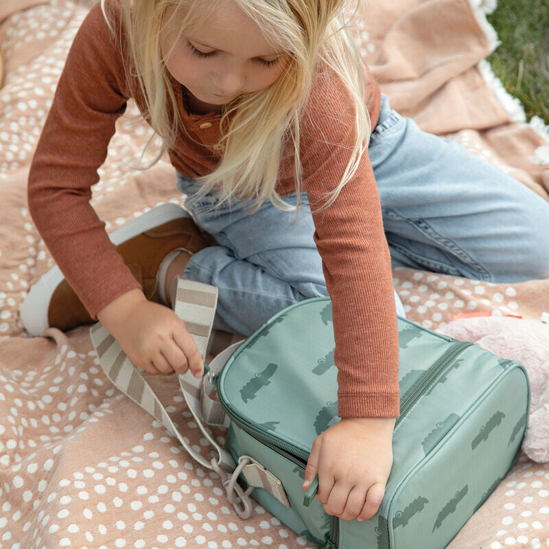 The insulated bag is designed in a nice green colour with an all-over print of Croco, the crocodile. Handle and shoulder strap have Done by Deer signature stripes in sand. The durable and weatherproof fabric is easy to clean with a damp cloth.