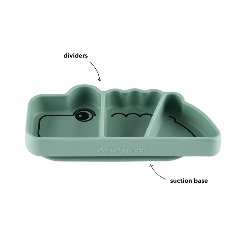 Press the silicone compartment plate down and it will stick to a smooth surface - with natural suction - preventing little ones from pushing, tipping, or throwing it. An easy-release flap is hidden under Croco's tail.