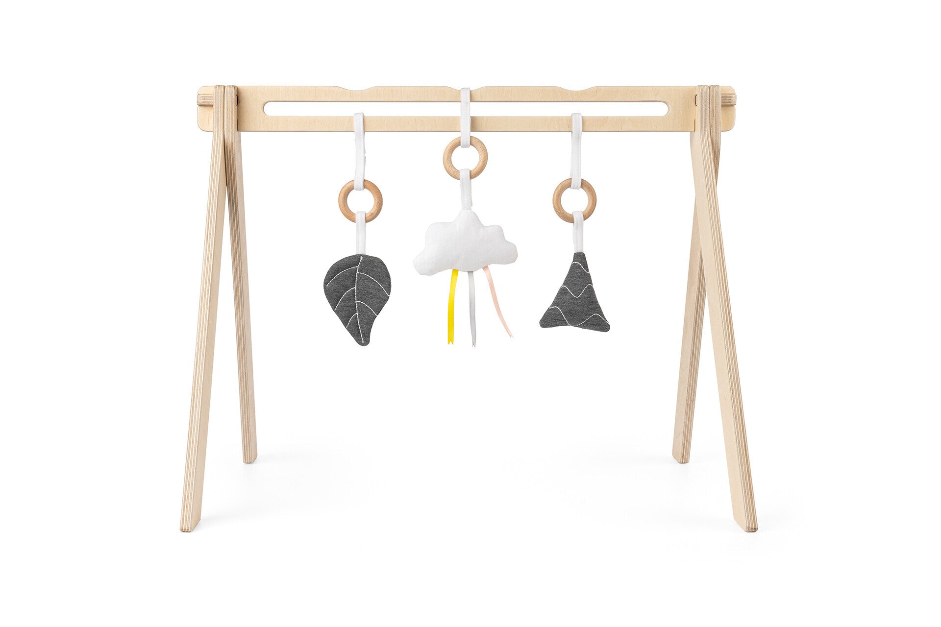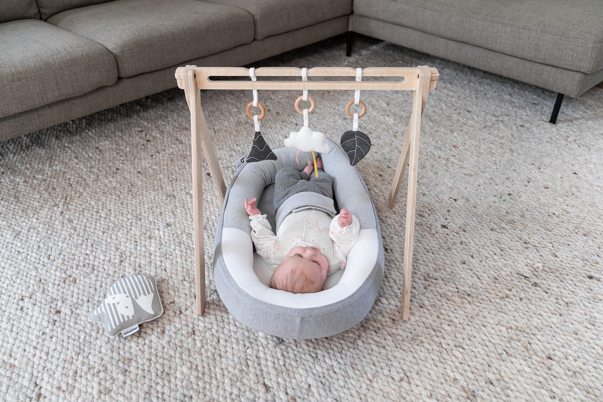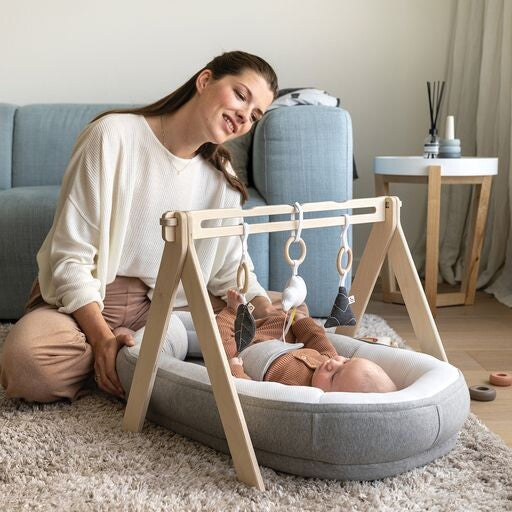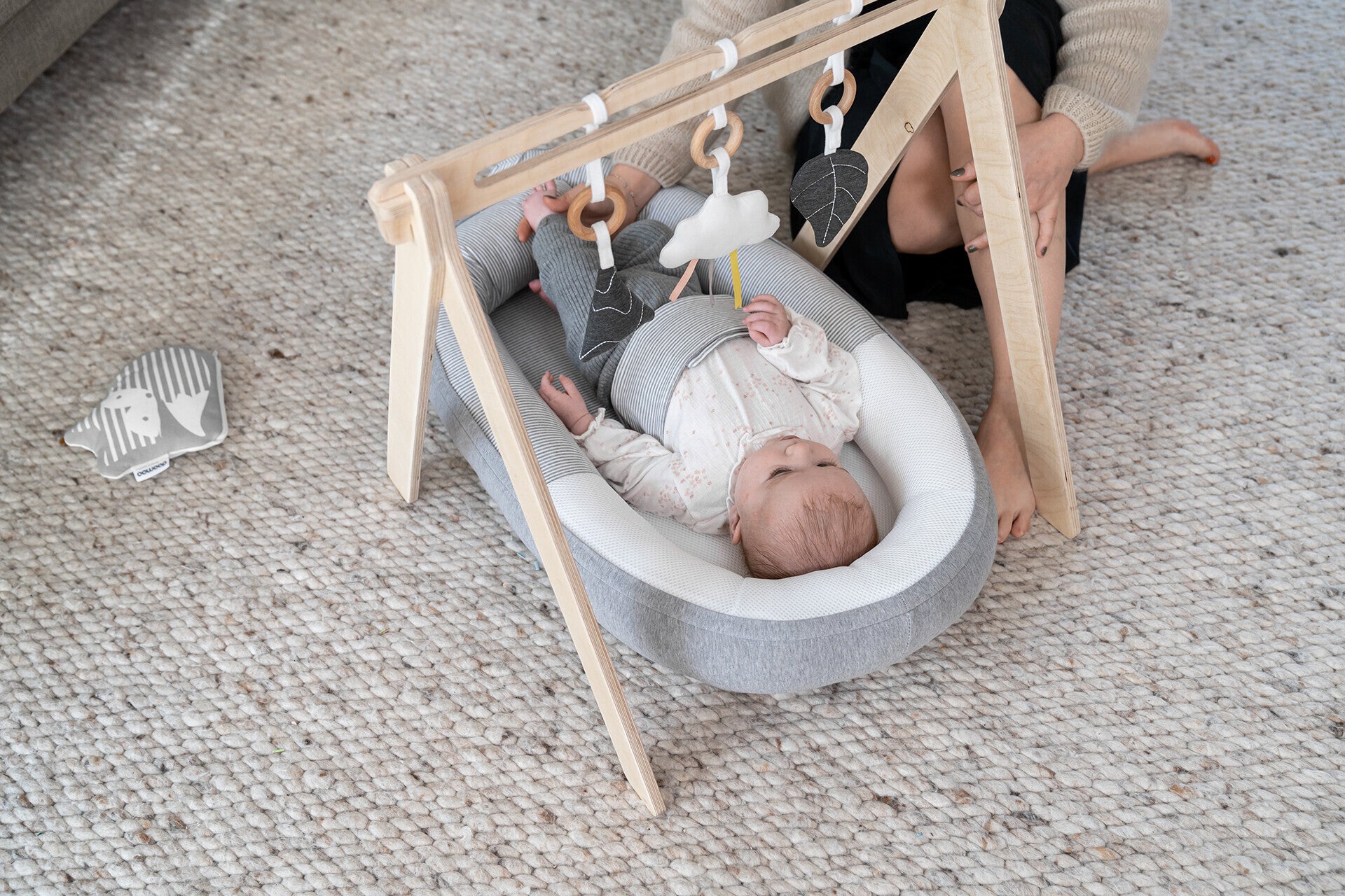 This baby gym fits perfectly in the Doomoo Cocoon but can also be used in a crib, on a playmat or with a bouncing chair. The toys are removable and can be adjusted in height. You can also attach other toys to the wooden baby gym.