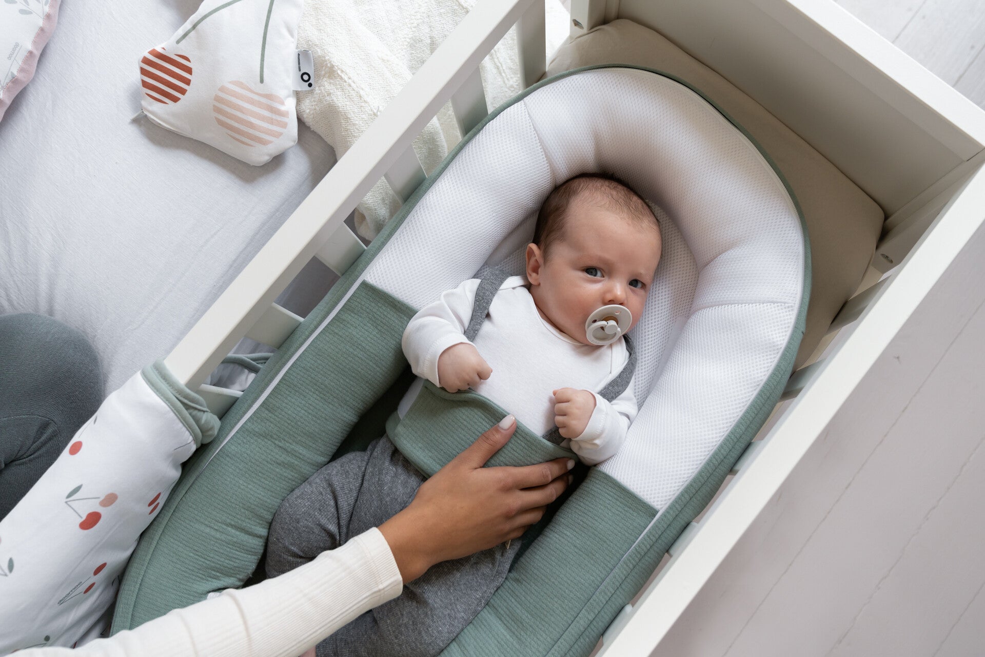 The Cocoon is easy to take along and to adjust to baby’s size. Your newborn can enjoy this little nest up onto 6 months.