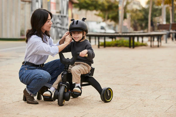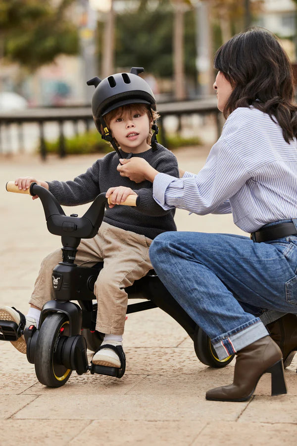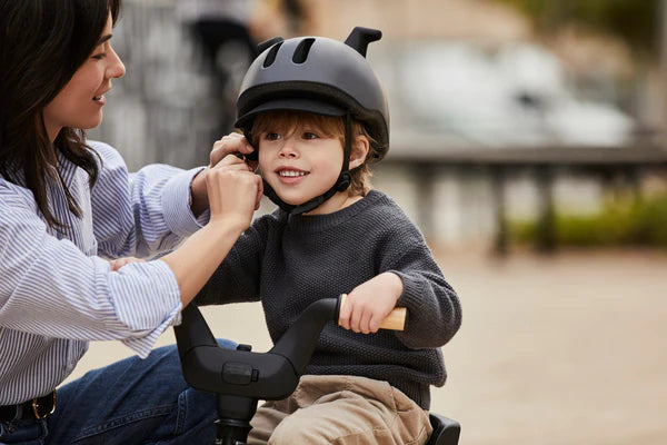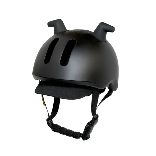 The Liki Helmet design features unique silicon horns on a matt black helmet. It provides ultimate protection with a dial-fit adjustment system for a secure and comfortable fit, a padded nylon adjustable chin strap and a Fidlock magnetic buckle for easy use. The Liki Helmet is designed to provide safety and protection not only for learning to ride with the Liki Trike but also for the next size of bicycle until the age of 4. The adjustable design allows the helmet to be used from age 1-4 years old, depending on the size of the child.