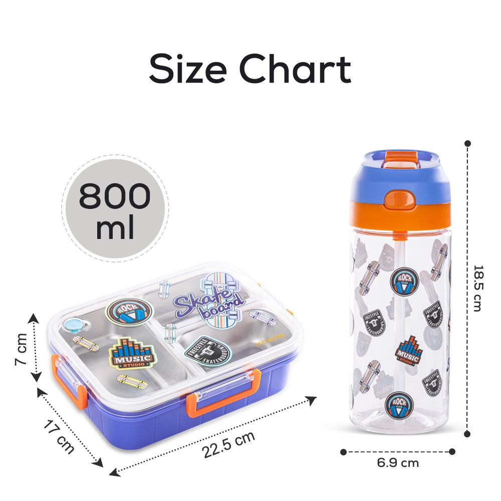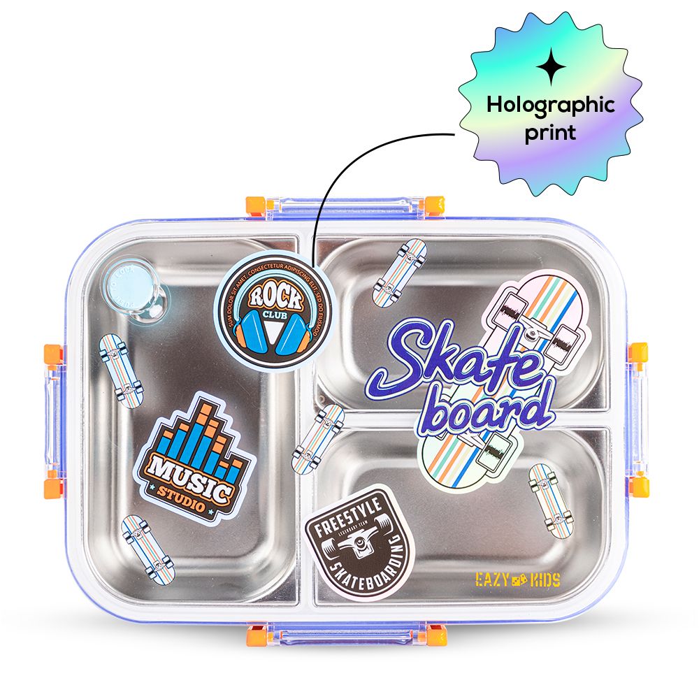 Eazy Kids 3 Compartment 800ml Stainless Steel bento Lunch Box With Water Bottle - Skate Board Purple