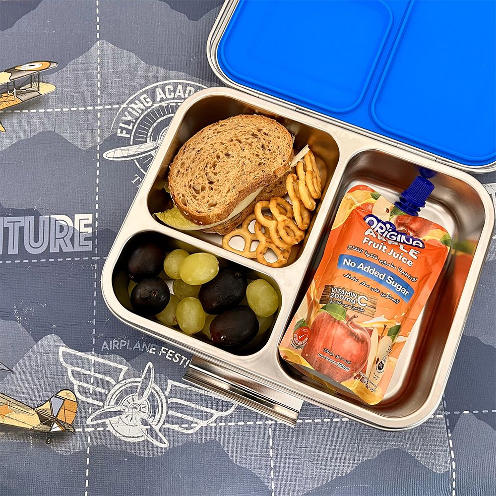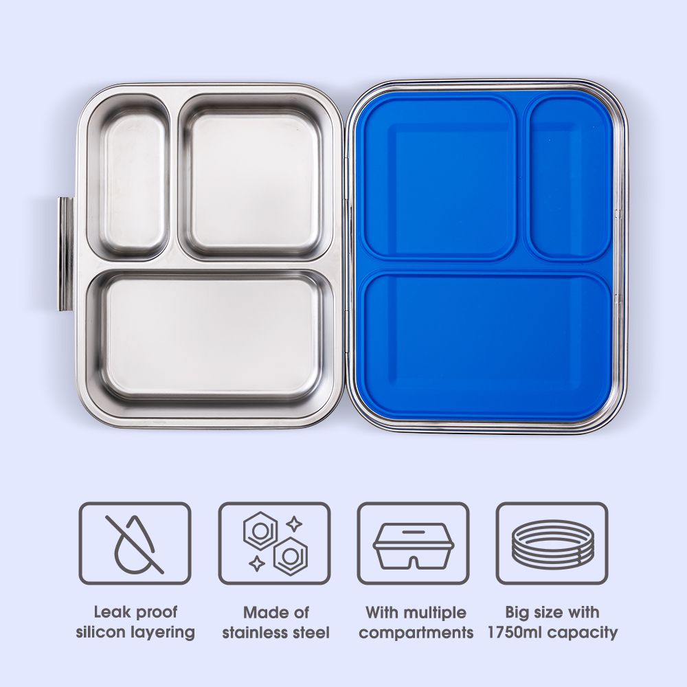The Eazy Kids 3 Compartment Bento Steel Lunch Box in Blue is the ultimate lunch solution for kids and adults alike. Made with high-grade, BPA-free stainless steel, it offers durability and eco-friendliness in one. With a total capacity of 1750ml, it features three compartments—ideal for separating main meals and snacks. The dual leak-proof sections ensure no spills, while its compact design makes it easy to fit in any backpack. Perfect for school, work, or picnics, it's unbreakable, reusable, and easy to clean. Pair it with Eazy Kids folding spoons and lunch bags for a complete mealtime kit.