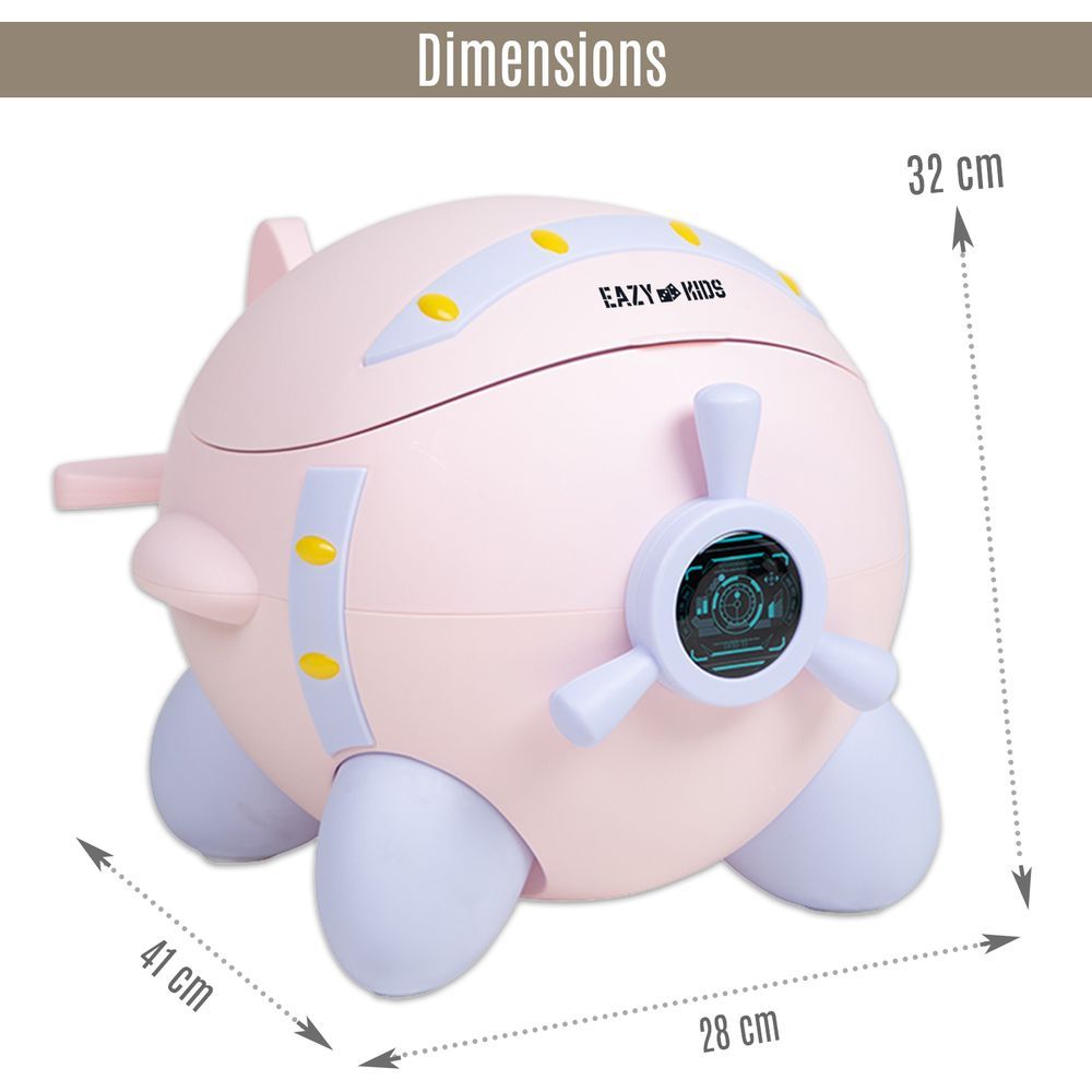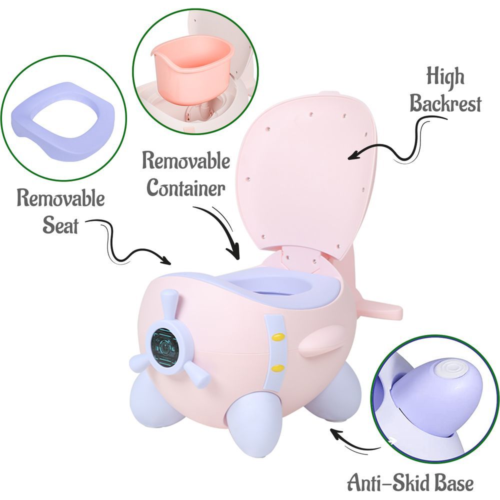 Eazy Kids new generation Airplane Potty Seat is a Fun way to potty train your Toddler. This baby potty has a cute Airplane shape with rounded corner and is equipped with a removable container and seat for convenience to clean easily. Gripped bottom makes sure that the potty seat is stable and doesn't move. Cute Cover helps to keep it covered when not in use. lid not only keeps the this closed but also serves as a backrest on which the child can lean while sitting. Little ones can play aviator while learning the simple but very important habit of their own needs.