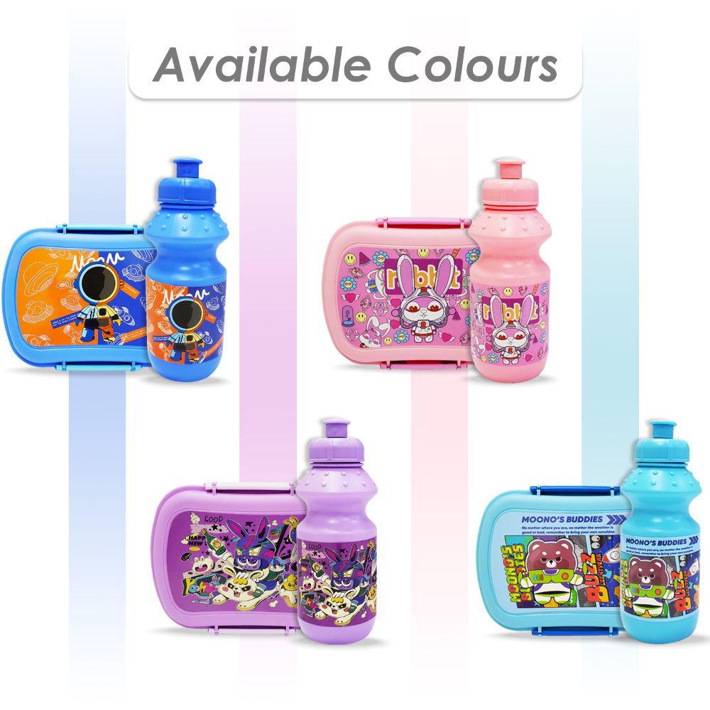 Lightweight and compact, the set includes a matching spoon and fork stored inside. The bottle is easy to open and sip, ensuring hydration on the go. Perfect for young kids, this matching set features a cute rabbit print and offers both form and function.