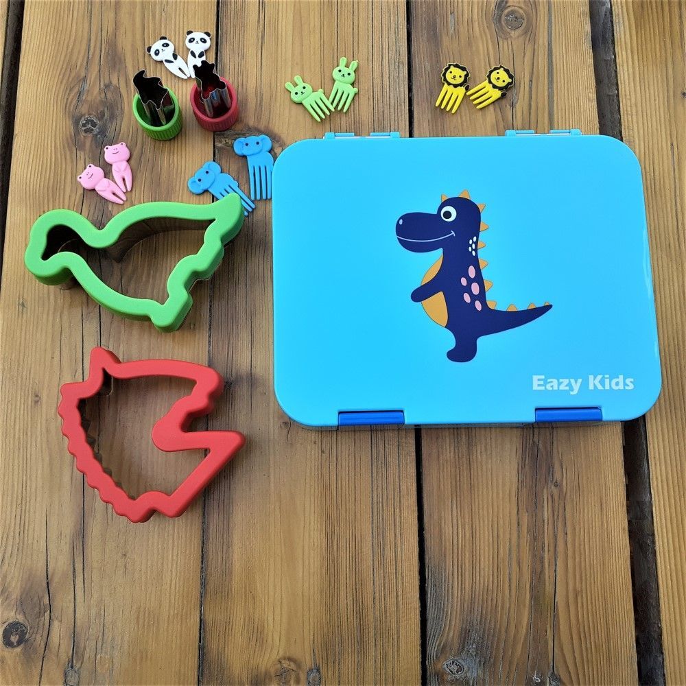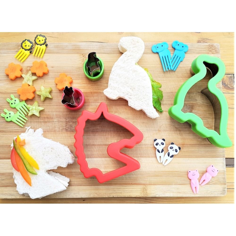 - Dinosaurthemed lunch box with 2 Sandwich Cutter, 2 Veggie Cutter and 10 Animal Shaped Fruit Picks to make meal times fun