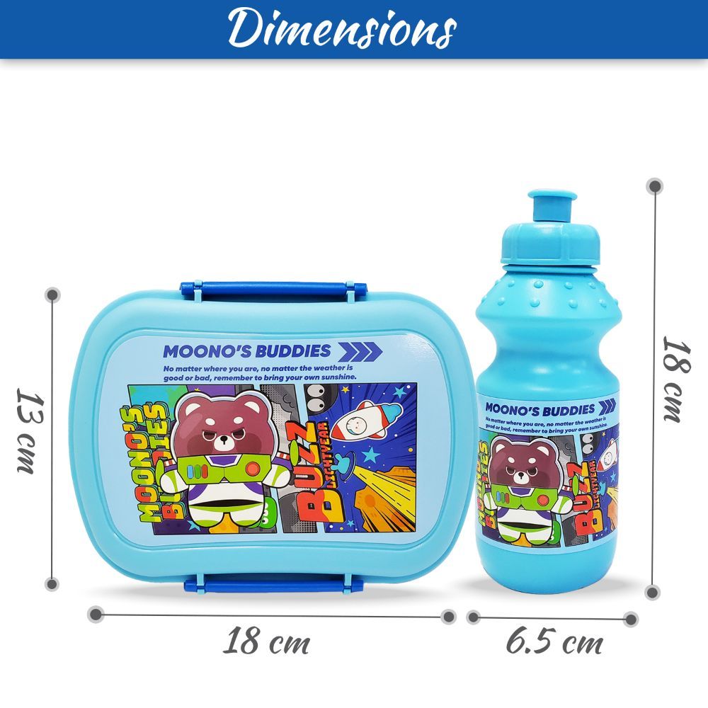 The Eazy Kids Lunch and Bottle Set includes a 2-compartment tiffin box (750ml) and a 350ml water bottle, ideal for a complete school meal. The lunch box is secured with dual clasp locks and is made of food-grade, BPA-free material.