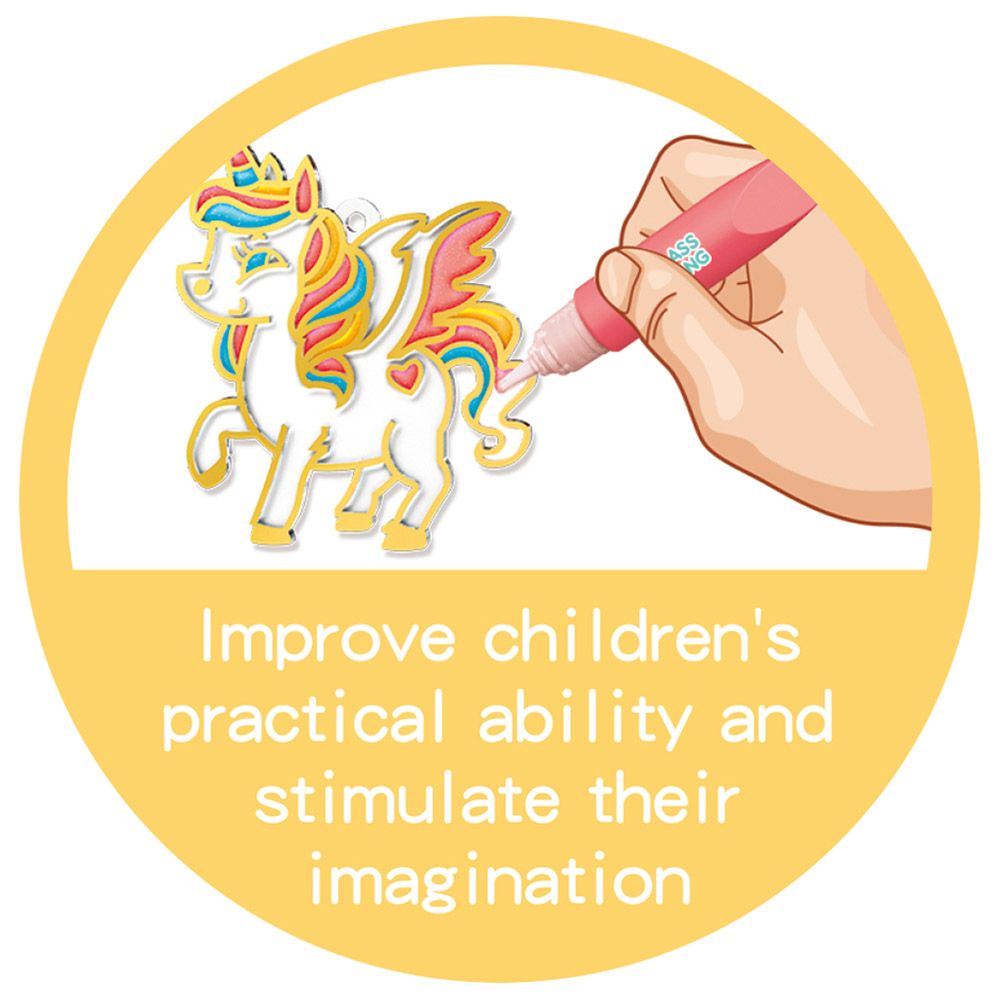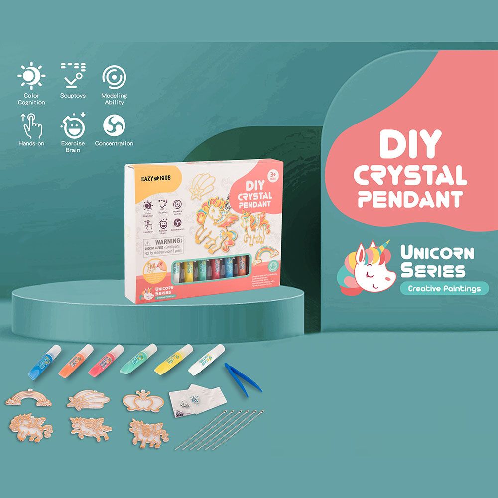 Unicorns represent the virtues of youth: curiosity and innocence. To a child, unicorns are the proof that magic exists, and it can change anything and fix everything. Eazy Kids Unicorn DIY Kids Art & Craft Crystal Pendant Making & Coloring Sets specially created for you . Comes with 6 pcs paint pen(5ml each), 6pcs suncatchers, 6pcs chain(14cm each), 3packs of diamonds(0.5gm each), 1 pc tweezer. With Crystal Pendant Making & Coloring Set you can do yourself Crystal Pendant Making, Coloring, Sticker Making, Perfect for Gifts to Birthday, Christmas and Halloween. Suitable for 3 year plus kid.
