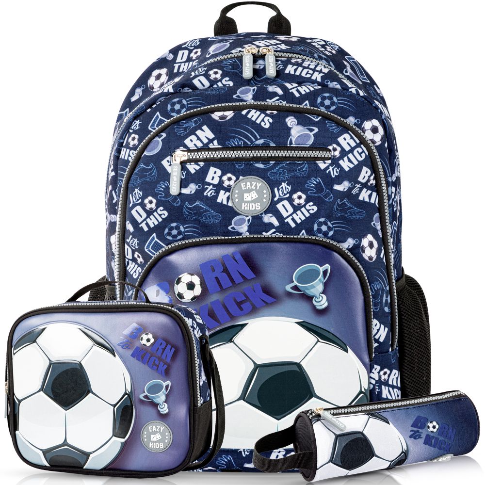 The Eazy Kids 18-Inch Football Backpack Set – ‘Born to Kick’ is the ultimate school gear for sporty kids. This 3-in-1 set includes a spacious 18-inch backpack with padded shoulder straps, two front zip pockets, a side bottle holder, and a padded laptop sleeve (up to 14”). The included insulated lunch bag keeps food fresh and features a two-way carry handle, while the coordinating pencil case neatly stores all school essentials. Made from durable, water-resistant polyester and designed for trolley compatibility, it’s perfect for class, travel, and daily adventure.