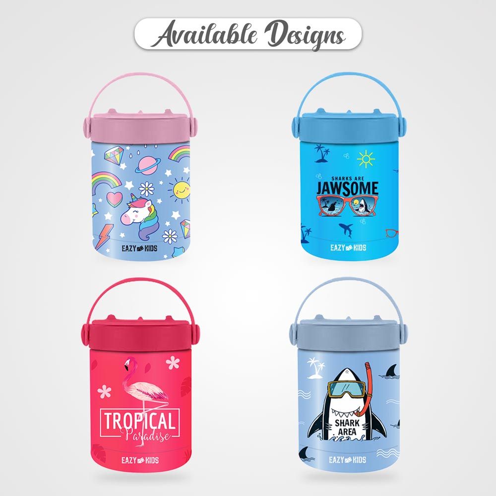 Includes a 350ml insulated stainless steel food jar that keeps food warm for 6–8 hours and cold for ~10 hours, with a folding spoon in the lid and silicone leakproof lining. Also includes a matching lunch bag in the same print and color. Bonus accessories: sandwich cutters, vegetable cutters, and fruit picks. Eco-friendly, non-toxic, and lightweight. A complete combo designed for fun, nutritious school meals.