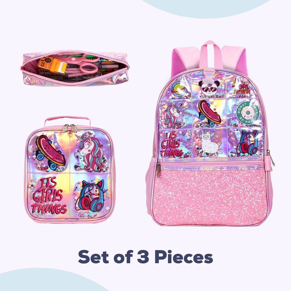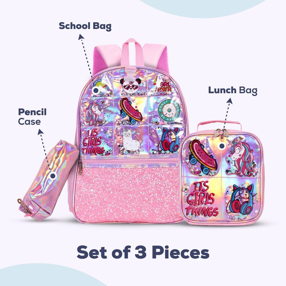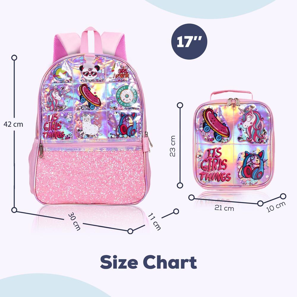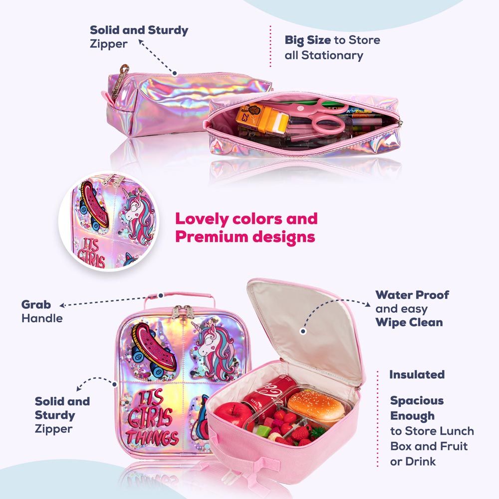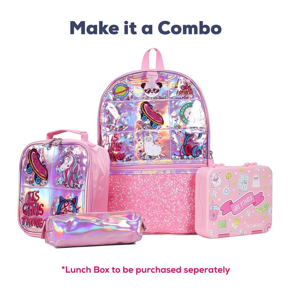 The Eazy Kids Girl Things Backpack Set (17 inch) offers both style and function with a bold, playful design. This 3-piece set includes a roomy backpack with multiple pockets for school essentials, a matching insulated lunch bag to keep meals fresh, and a pencil case for neat organization. Designed with padded straps and durable materials, it ensures comfortable wear and long-lasting use for daily school activities.