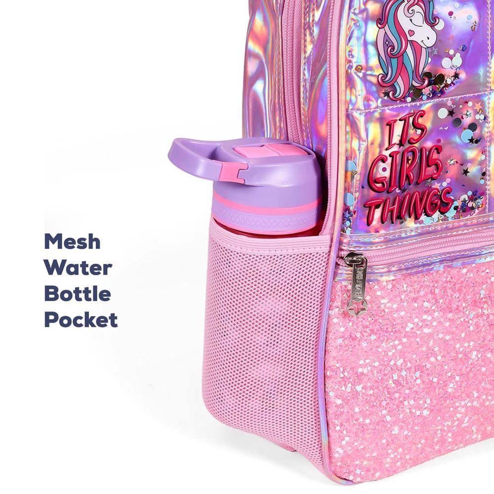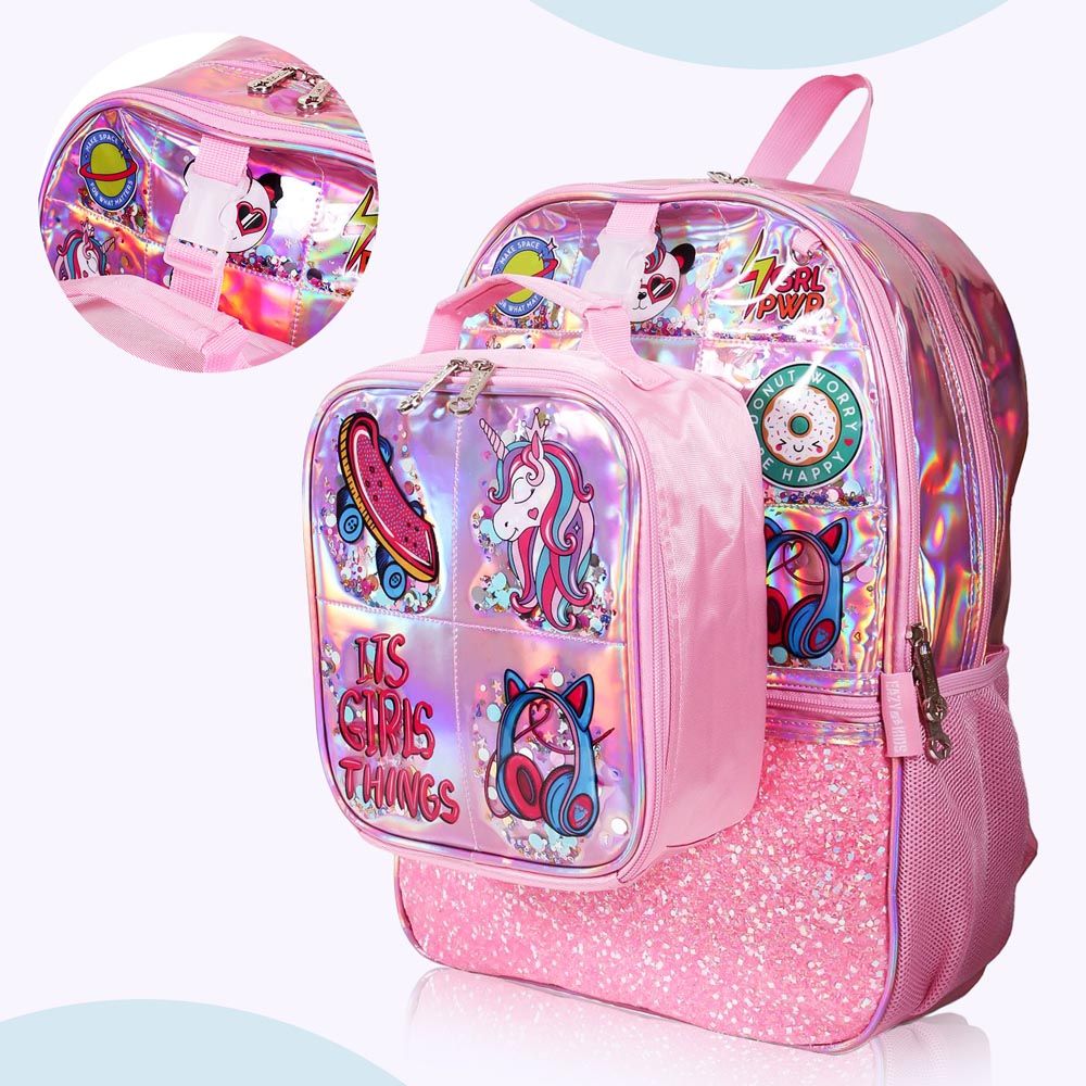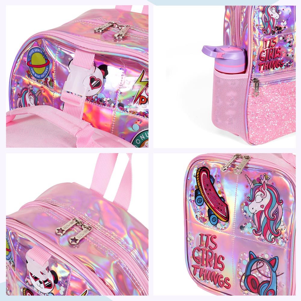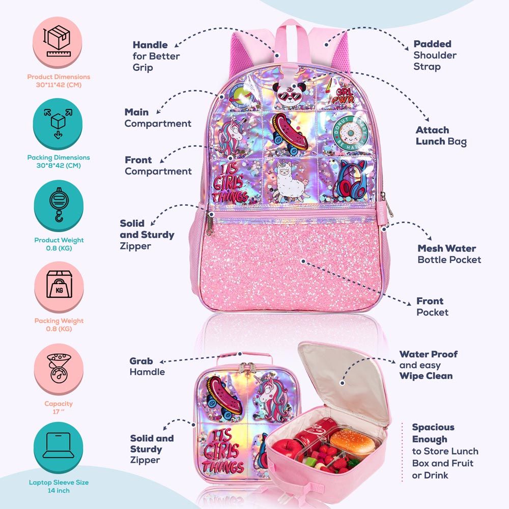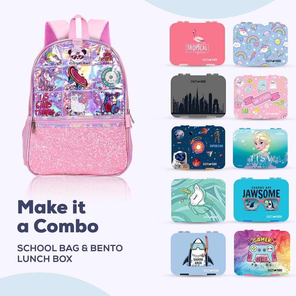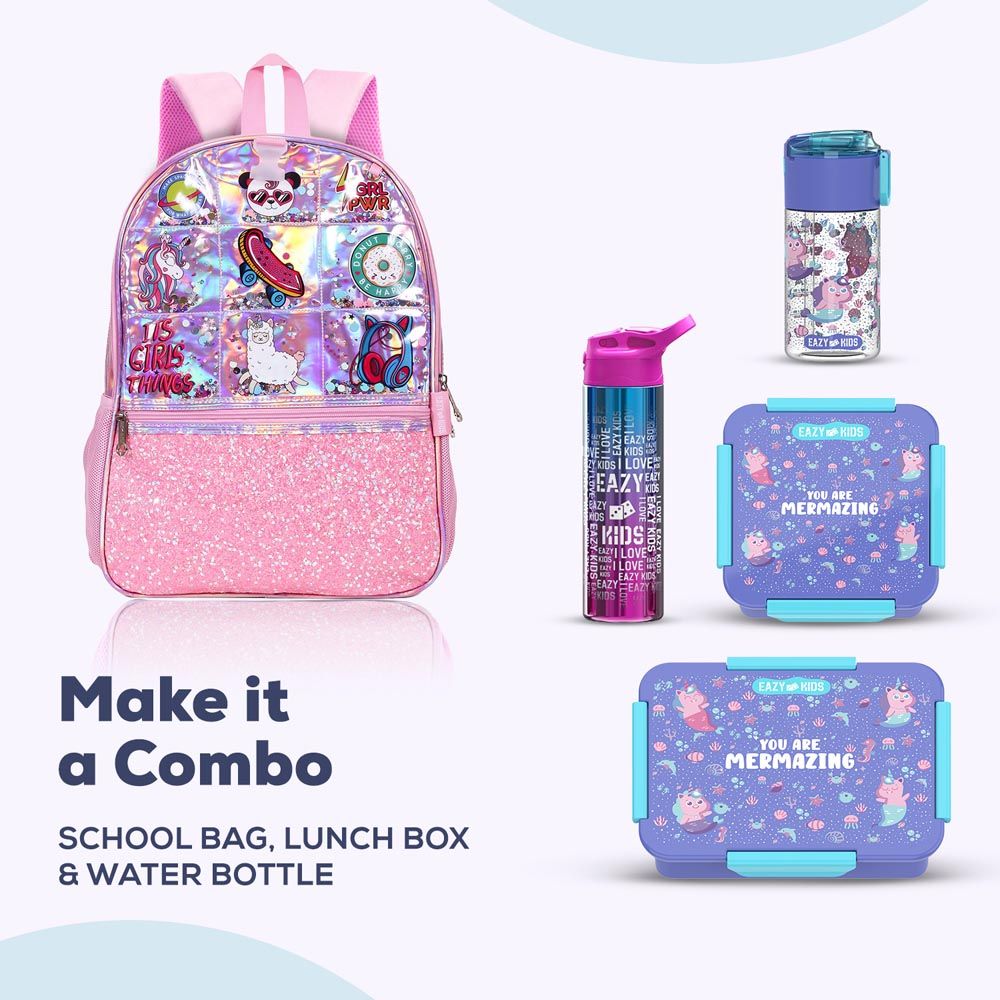 The Eazy Kids Girl Things Backpack Set (17 inch) offers both style and function with a bold, playful design. This 3-piece set includes a roomy backpack with multiple pockets for school essentials, a matching insulated lunch bag to keep meals fresh, and a pencil case for neat organization. Designed with padded straps and durable materials, it ensures comfortable wear and long-lasting use for daily school activities.
