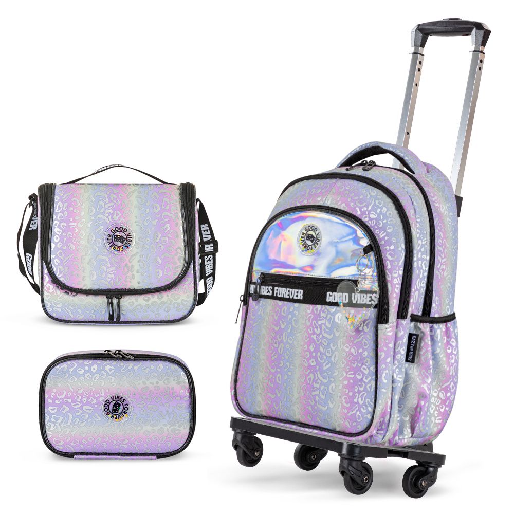 - Sparkly & Stylish School Backpack For Girls: Designed with vibrant colours, shimmering details, and cute patterns that make every school day extra special paired with 4 wheel trolley.