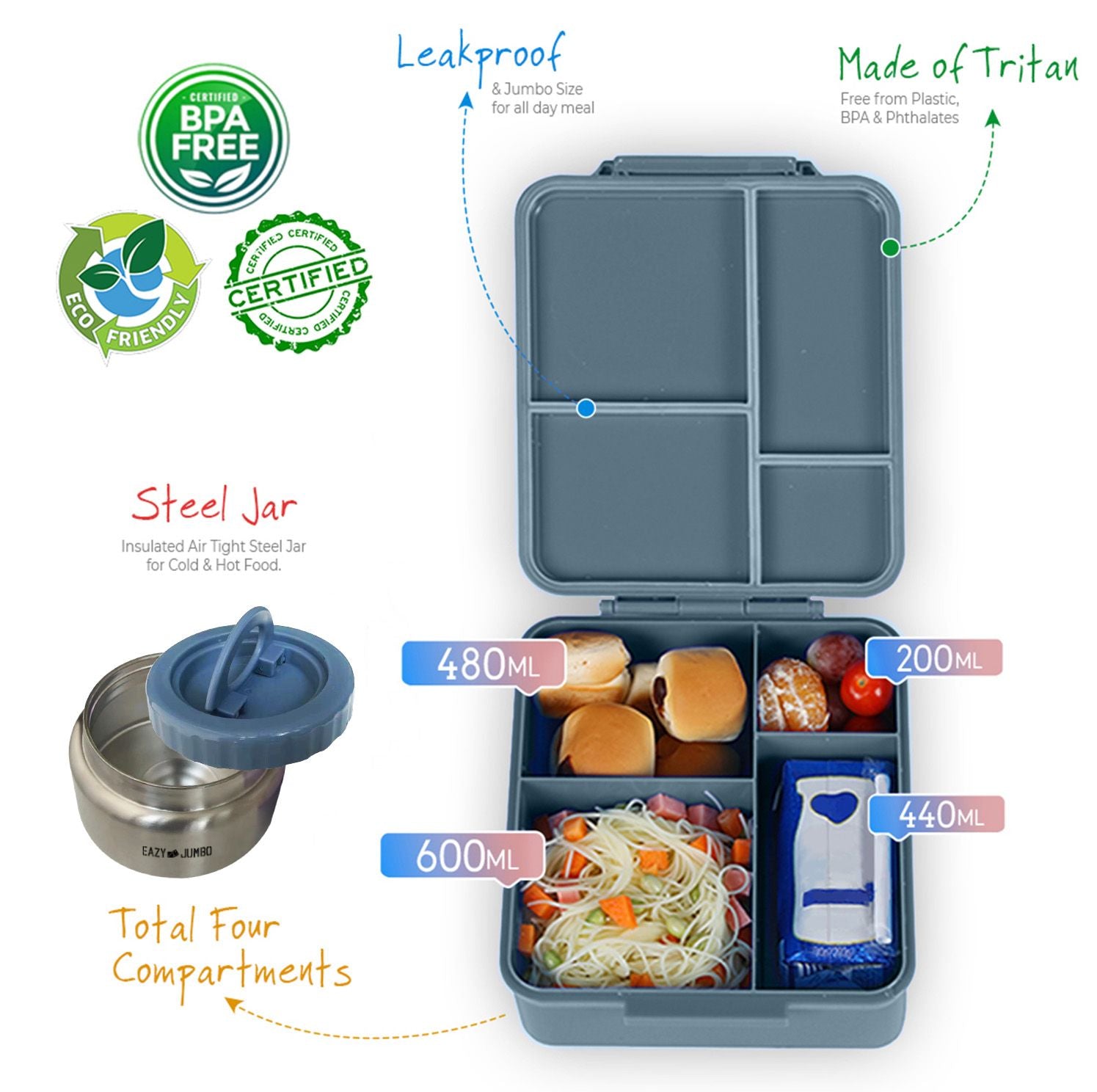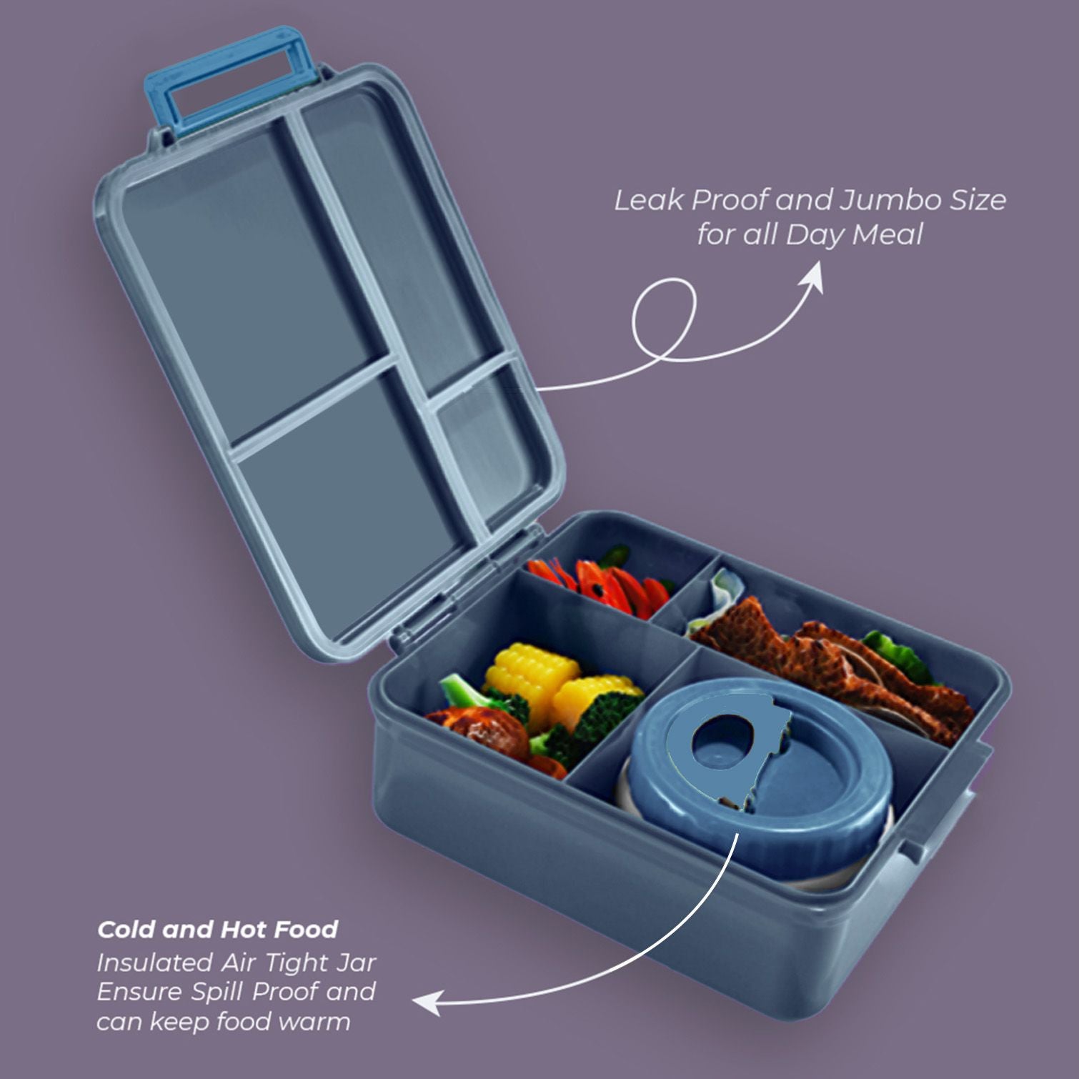 - Spacious and Versatile: The Jumbo Bento Lunch Box is designed to pack both hot and cold foods together, perfect for teens and kids. It includes four large compartments that can be used with or without the insulated jar.