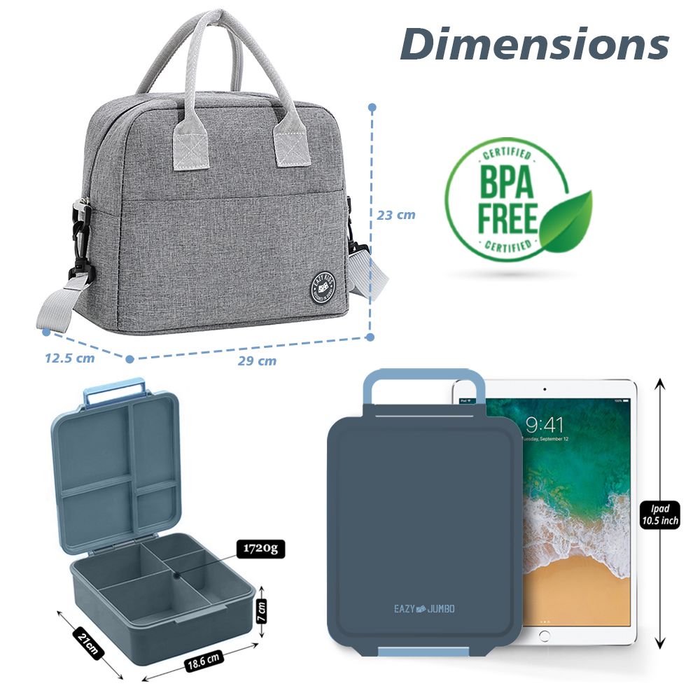 Packing Includes: 1 x Jumbo Lunch Box (1720 ml), 1 x Lunch Bag, 1 x Insulated Airtight Steel Jar (250 ml), 1 x Silicone Sauce Jar (60 ml).