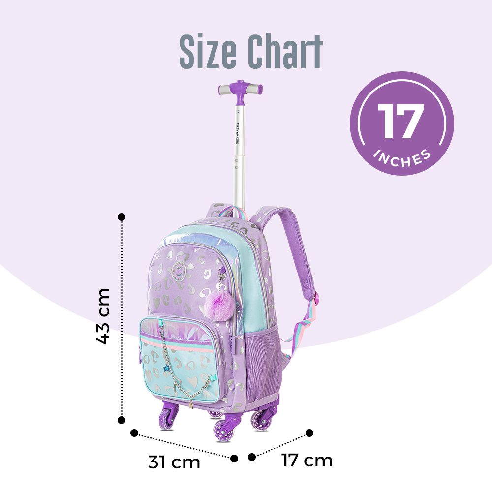 The Eazy Kids 17-Inch 4-Wheel Trolley School Bag Set in vibrant purple combines style, comfort, and practicality. It includes a trolley backpack with a 20L capacity, lunch bag, and pencil case. The trolley backpack features a telescopic handle, four smooth wheels for effortless rolling, padded shoulder straps, cushioned back support, and a 14-inch laptop compartment. Multiple pockets allow for easy organization. Crafted from durable polyester with reinforced stitching and sturdy zippers, it’s built to endure daily school wear. The lightweight design lets kids switch between carrying and rolling with ease. Specifications: Product Weight: 0.21 kg (Backpack), 0.04 kg (Lunch Bag), 0.65 kg (Pencil Case) Packing Weight: 2 kg Product Dimensions: 31 x 17 x 43 cm (Backpack), 25 x 9 x 20 cm (Lunch Bag), 23 x 7 x 12 cm (Pencil Case) Packing Dimensions: 32 x 20 x 48 cm Material: Polyester Product Size / Load Bearing: 17 Inch / 20L What’s Included: 1 Trolley Backpack, 1 Lunch Bag, 1 Pencil Case