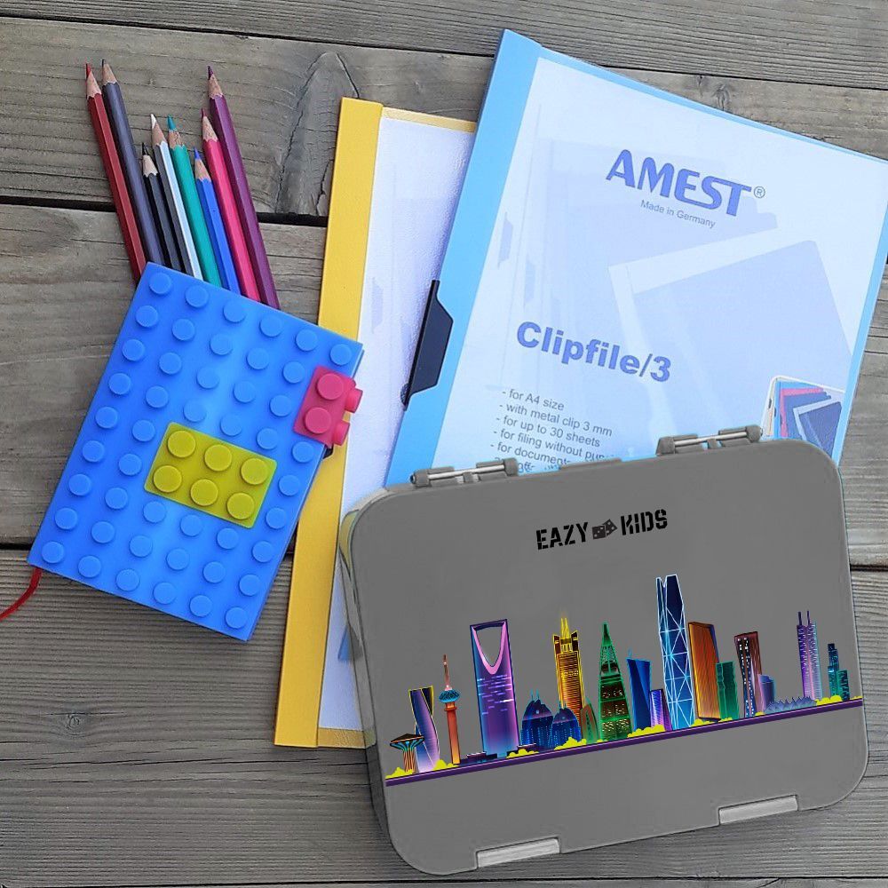 Designed for function and safety, the Eazy Kids Bento Set in Love Riyadh Grey includes a 4-compartment Tritan lunch box—free from BPA, BPS, and harmful chemicals. It features individual silicon seals on each lid section, keeping meals fresh and preventing leaks.